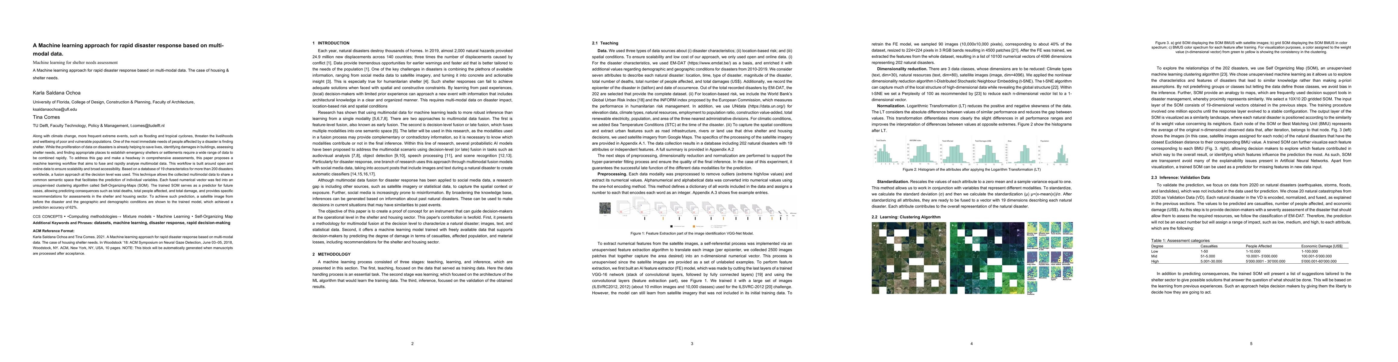 Along with climate change, more frequent extreme events, such as flooding and tropical cyclones, threaten the livelihoods and wellbeing of poor and vulnerable populations. One of the most immediate needs of people affected by a disaster is finding shelter. While the proliferation of data on disasters is already helping to save lives, identifying damages in buildings, assessing shelter needs, and finding appropriate places to establish emergency shelters or settlements require a wide range of data to be combined rapidly. To address this gap and make a headway in comprehensive assessments, this paper proposes a machine learning workflow that aims to fuse and rapidly analyse multimodal data. This workflow is built around open and online data to ensure scalability and broad accessibility. Based on a database of 19 characteristics for more than 200 disasters worldwide, a fusion approach at the decision level was used. This technique allows the collected multimodal data to share a common semantic space that facilitates the prediction of individual variables. Each fused numerical vector was fed into an unsupervised clustering algorithm called Self-Organizing-Maps (SOM). The trained SOM serves as a predictor for future cases, allowing predicting consequences such as total deaths, total people affected, and total damage, and provides specific recommendations for assessments in the shelter and housing sector. To achieve such prediction, a satellite image from before the disaster and the geographic and demographic conditions are shown to the trained model, which achieved a prediction accuracy of 62 %
