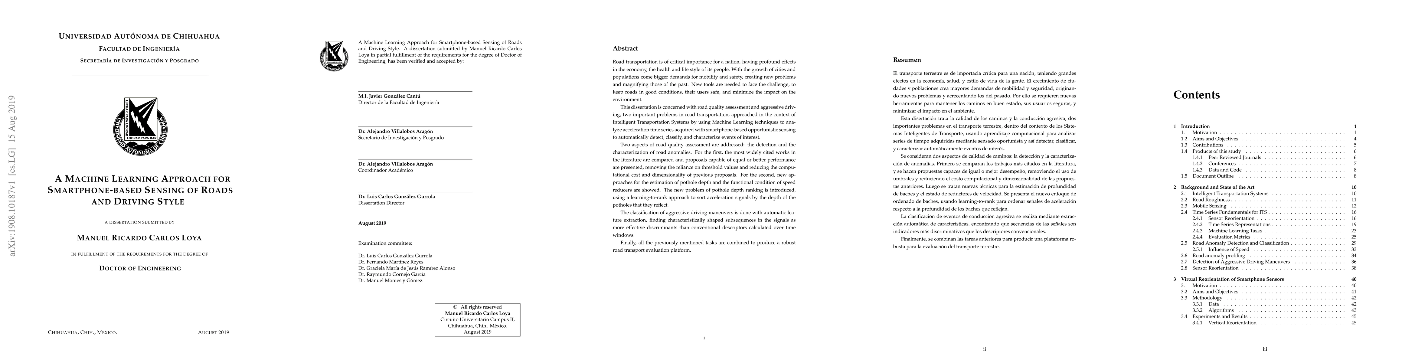 Road transportation is of critical importance for a nation, having profound effects in the economy, the health and life style of its people. With the growth of cities and populations come bigger demands for mobility and safety, creating new problems and magnifying those of the past. New tools are needed to face the challenge, to keep roads in good conditions, their users safe, and minimize the impact on the environment. This dissertation is concerned with road quality assessment and aggressive driving, two important problems in road transportation, approached in the context of Intelligent Transportation Systems by using Machine Learning techniques to analyze acceleration time series acquired with smartphone-based opportunistic sensing to automatically detect, classify, and characterize events of interest. Two aspects of road quality assessment are addressed: the detection and the characterization of road anomalies. For the first, the most widely cited works in the literature are compared and proposals capable of equal or better performance are presented, removing the reliance on threshold values and reducing the computational cost and dimensionality of previous proposals. For the second, new approaches for the estimation of pothole depth and the functional condition of speed reducers are showed. The new problem of pothole depth ranking is introduced, using a learning-to-rank approach to sort acceleration signals by the depth of the potholes that they reflect. The classification of aggressive driving maneuvers is done with automatic feature extraction, finding characteristically shaped subsequences in the signals as more effective discriminants than conventional descriptors calculated over time windows. Finally, all the previously mentioned tasks are combined to produce a robust road transport evaluation platform.