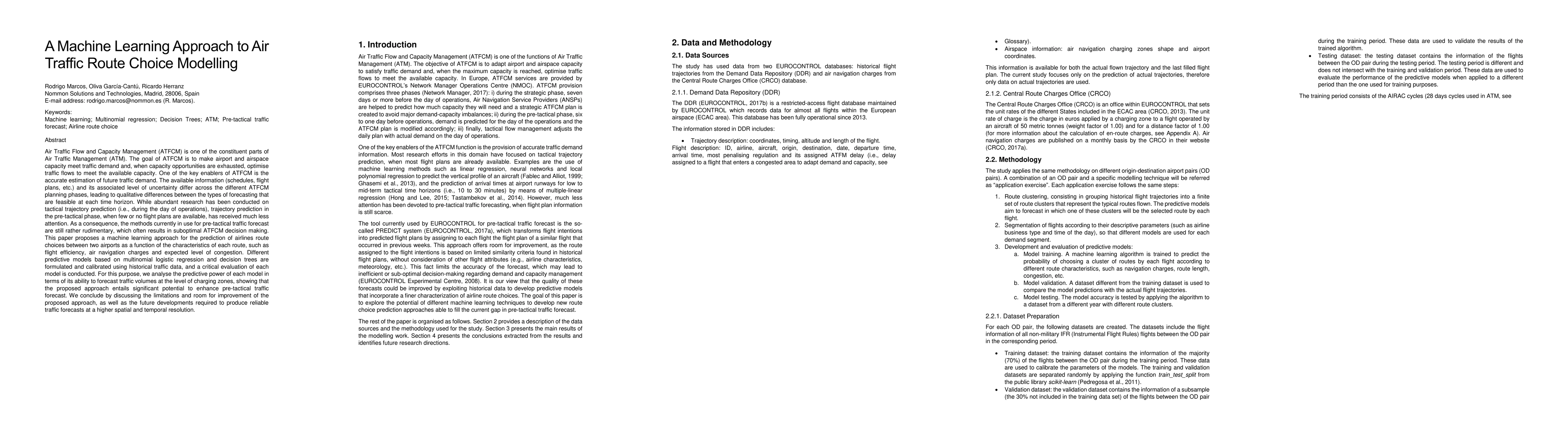 This paper proposes a machine learning approach to model airlines' route choice decisions using multinomial logistic regression and decision trees, aiming to improve pre-tactical air traffic forecasts. The study evaluates the models' predictive capabilities for forecasting traffic volumes at charging zones, showing potential to enhance Air Traffic Flow and Capacity Management.