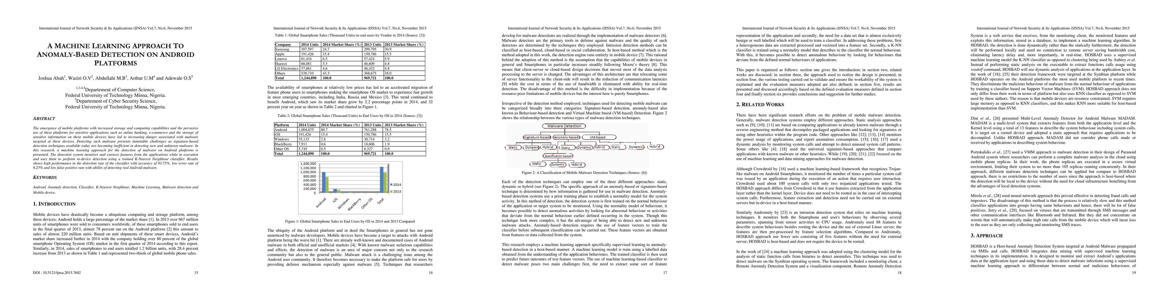 The emergence of mobile platforms with increased storage and computing capabilities and the pervasive use of these platforms for sensitive applications such as online banking, e-commerce and the storage of sensitive information on these mobile devices have led to increasing danger associated with malware targeted at these devices. Detecting such malware presents inimitable challenges as signature-based detection techniques available today are becoming inefficient in detecting new and unknown malware. In this research, a machine learning approach for the detection of malware on Android platforms is presented. The detection system monitors and extracts features from the applications while in execution and uses them to perform in-device detection using a trained K-Nearest Neighbour classifier. Results shows high performance in the detection rate of the classifier with accuracy of 93.75%, low error rate of 6.25% and low false positive rate with ability of detecting real Android malware.