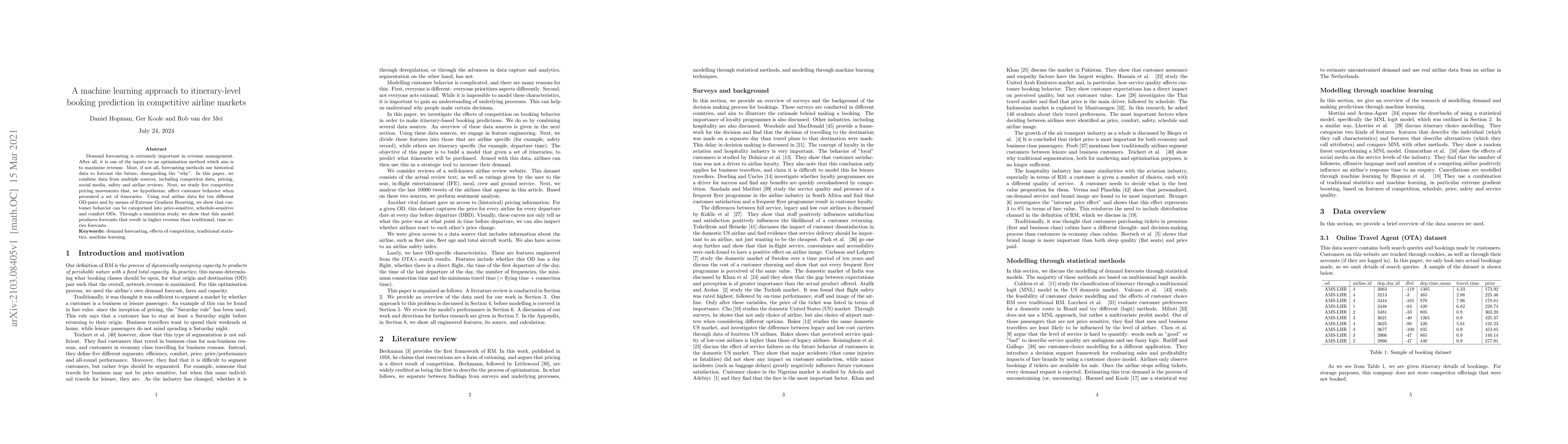 This paper employs machine learning, specifically Extreme Gradient Boosting, to predict itinerary-level bookings in competitive airline markets by integrating diverse data sources. The study shows that customer behavior can be categorized into price-sensitive, schedule-sensitive, and comfort-oriented patterns, leading to revenue-maximizing forecasts outperforming traditional time series methods.