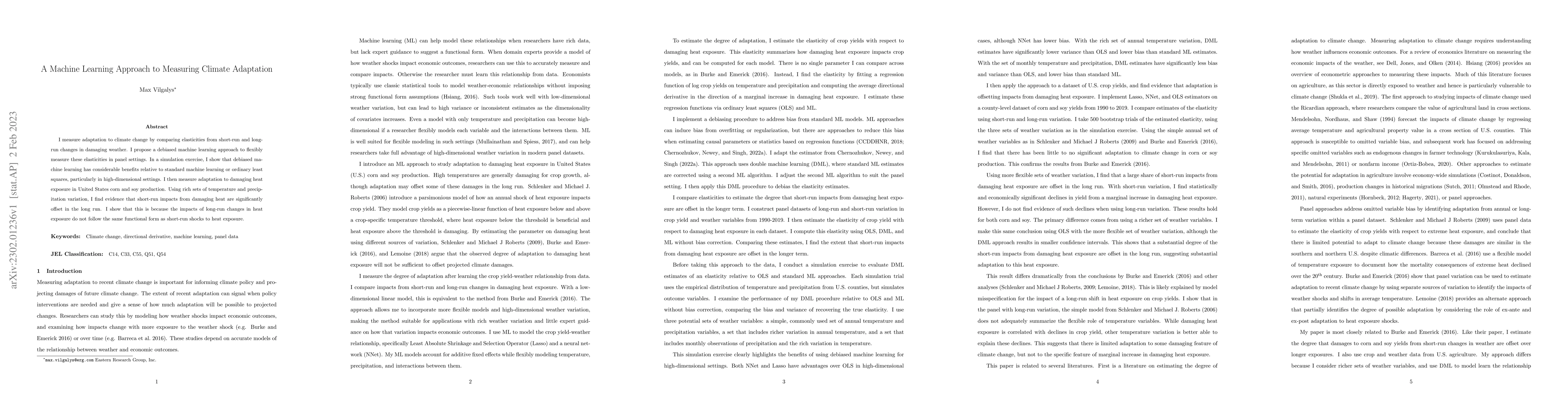 This paper proposes a debiased machine learning approach to measure climate adaptation by comparing elasticities from short-term and long-term changes in damaging weather. The method shows significant benefits over standard machine learning and OLS, especially in high-dimensional settings, and demonstrates that U.S. corn and soy production adapt to long-term heat exposure differently than they respond to short-term heat shocks.