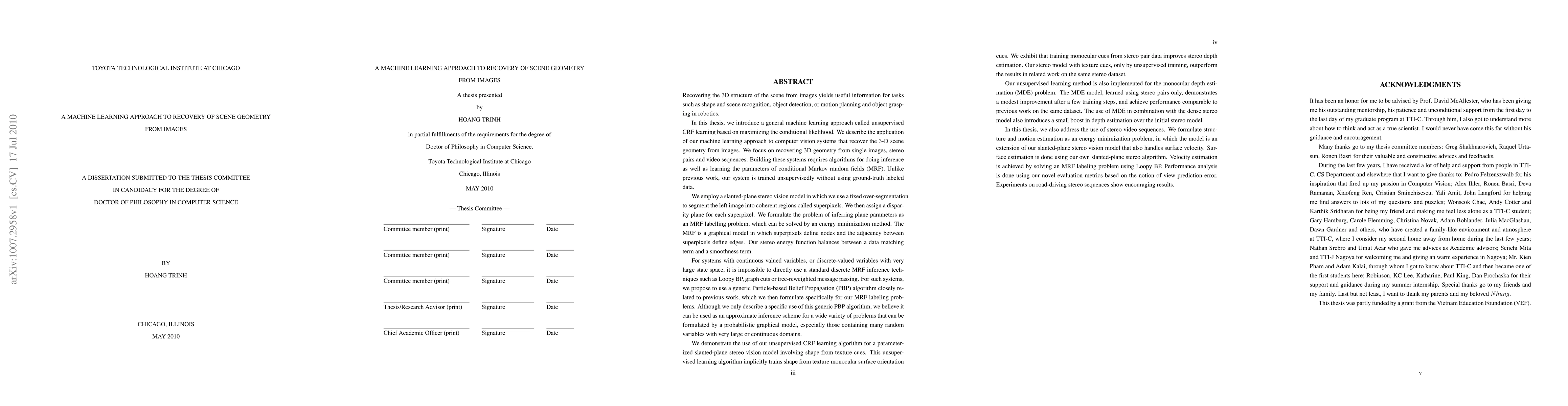 This research introduces a machine learning approach for unsupervised recovery of 3D scene geometry from images, employing conditional random fields (CRF) to maximize conditional likelihood without ground-truth data. The method outperforms related work on stereo datasets and extends to estimate surface velocity in road-driving sequences.