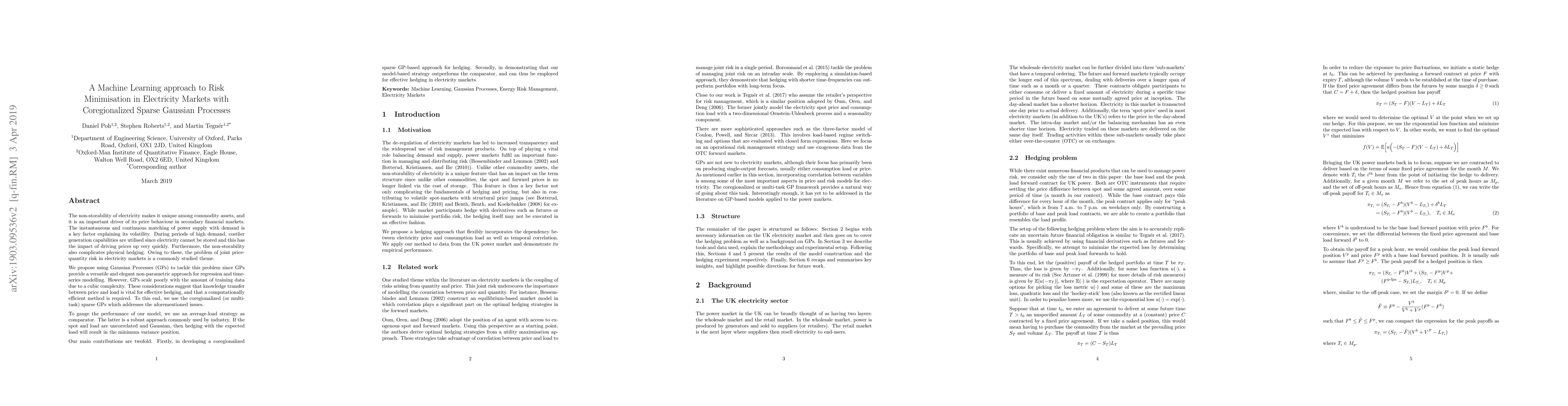 This paper proposes a coregionalized sparse Gaussian Processes approach for minimizing risk in electricity markets, addressing the challenges of non-storability and high volatility. The model demonstrates superior performance compared to the average-load strategy, indicating its effectiveness for hedging in these markets.