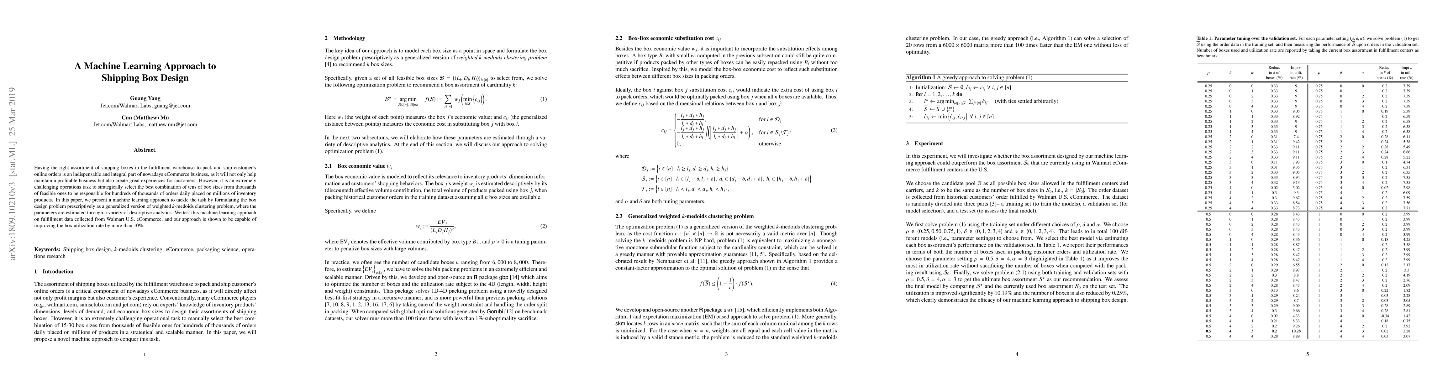 Having the right assortment of shipping boxes in the fulfillment warehouse to pack and ship customer's online orders is an indispensable and integral part of nowadays eCommerce business, as it will not only help maintain a profitable business but also create great experiences for customers. However, it is an extremely challenging operations task to strategically select the best combination of tens of box sizes from thousands of feasible ones to be responsible for hundreds of thousands of orders daily placed on millions of inventory products. In this paper, we present a machine learning approach to tackle the task by formulating the box design problem prescriptively as a generalized version of weighted $k$-medoids clustering problem, where the parameters are estimated through a variety of descriptive analytics. We test this machine learning approach on fulfillment data collected from Walmart U.S. eCommerce, and our approach is shown to be capable of improving the box utilization rate by more than $10\%$.