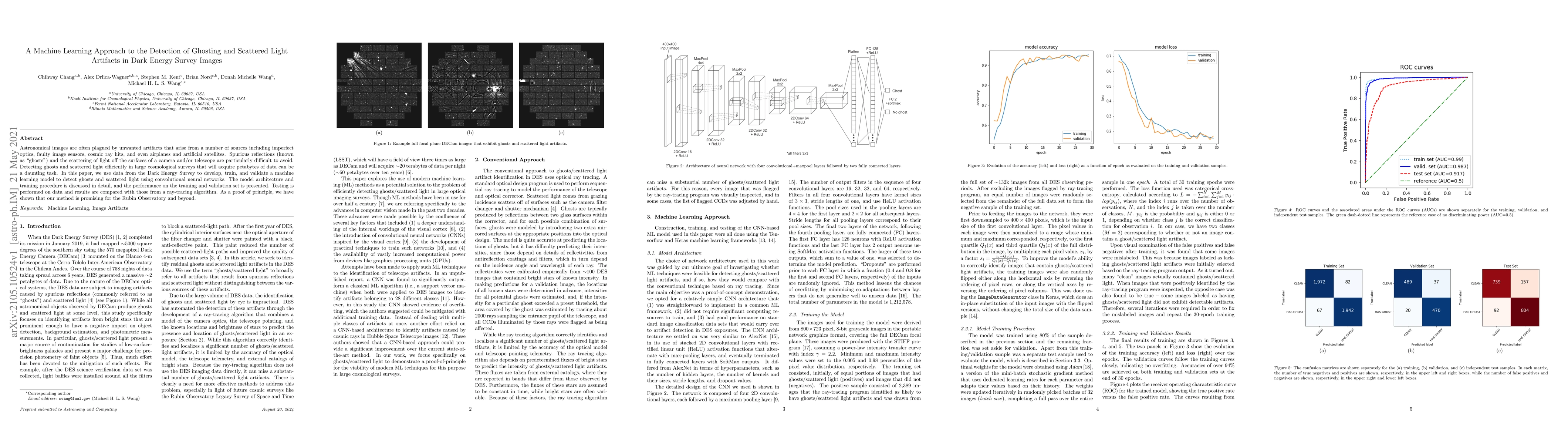 Researchers developed a machine learning model to detect ghosting and scattered light artifacts in astronomical images using convolutional neural networks, achieving promising results on the Dark Energy Survey data.