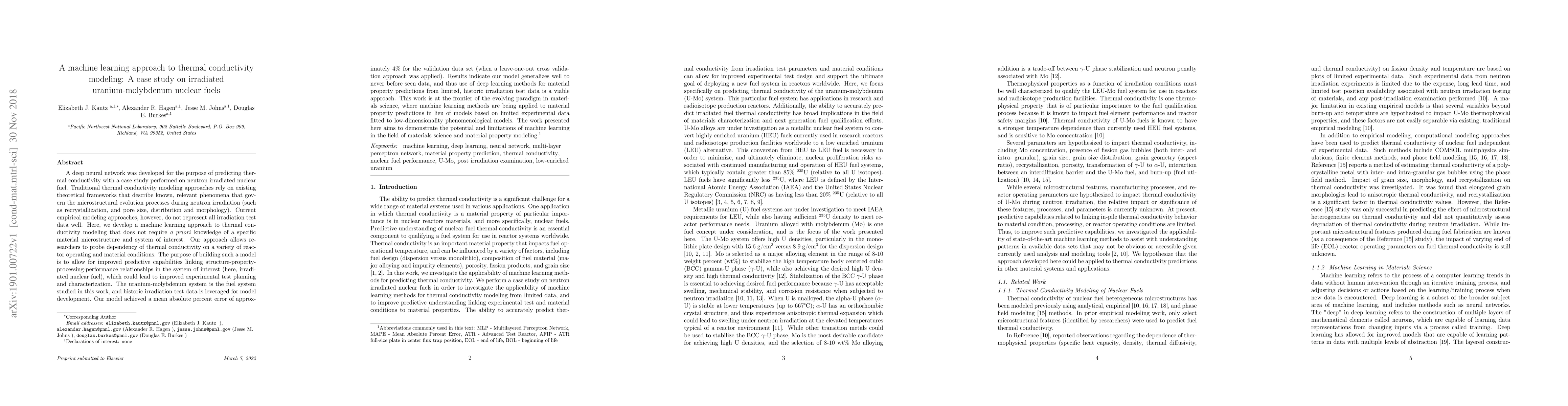This paper develops a deep neural network for predicting thermal conductivity in irradiated uranium-molybdenum nuclear fuels, bypassing traditional theoretical frameworks. The machine learning model achieved a mean absolute percent error of 4% on validation data, demonstrating its potential for improved predictive capabilities in material property modeling.