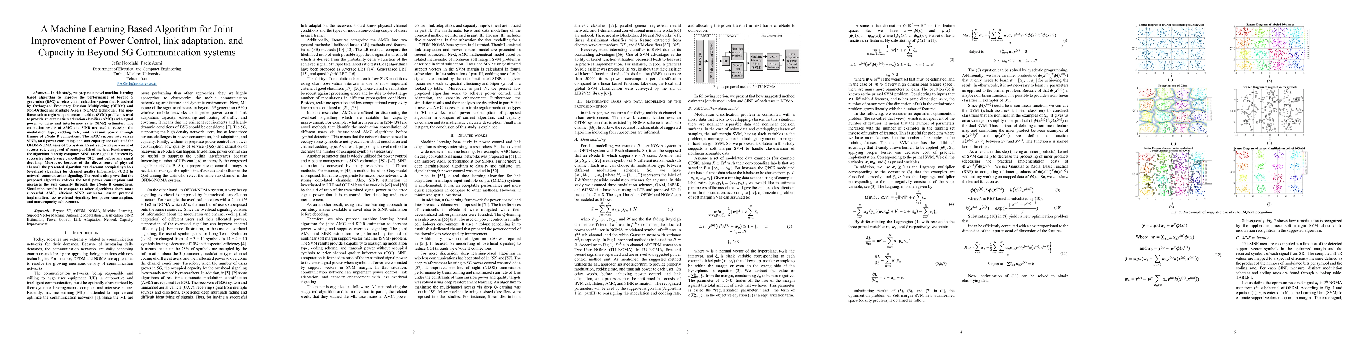 This paper proposes a machine learning algorithm to enhance power control, link adaptation, and capacity in B5G communication systems using OFDM and NOMA. The algorithm leverages a non-linear SVM for AMC and SINR estimation, optimizing modulation type, coding rate, and transmit power, resulting in improved success rates, lower power consumption, and higher sum capacity.