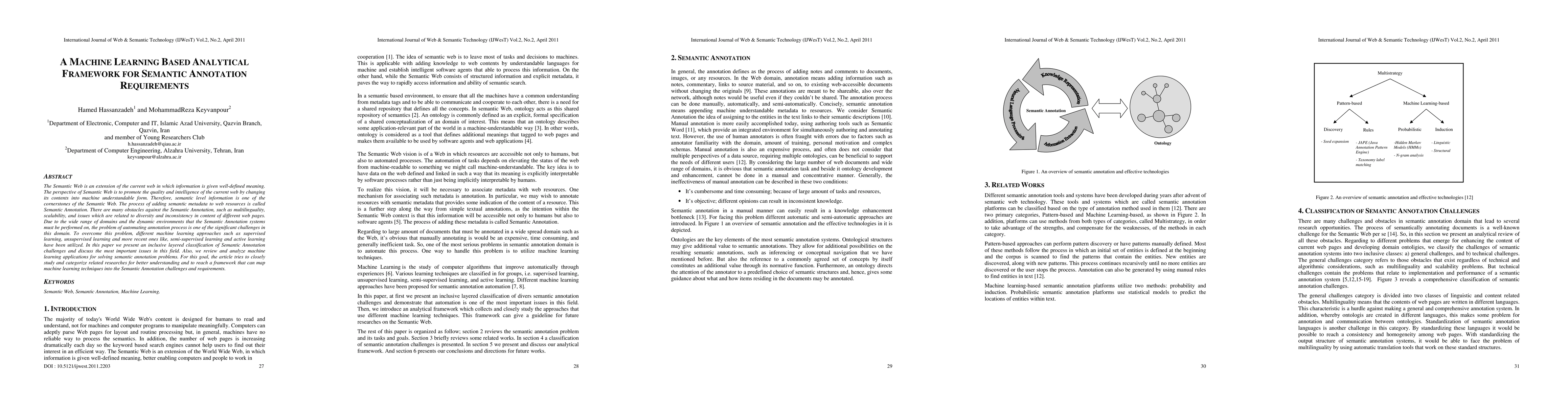 This paper presents a machine learning-based analytical framework for semantic annotation, addressing challenges like multilinguality and scalability in the Semantic Web. It reviews various machine learning approaches, including supervised, unsupervised, and semi-supervised learning, to automate the semantic annotation process and proposes a layered classification of related challenges.