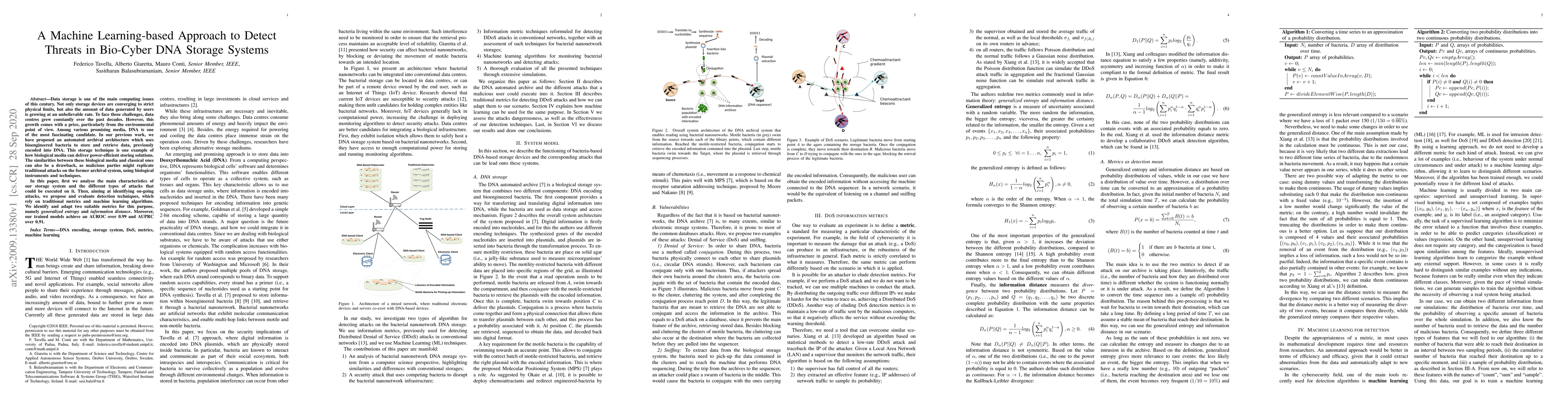 This paper proposes a machine learning-based approach to detect threats in bio-cyber DNA storage systems, analyzing potential attacks and employing generalized entropy and information distance metrics. The machine learning models achieve high detection accuracy with AUROC over 0.99 and AUPRC over 0.91.