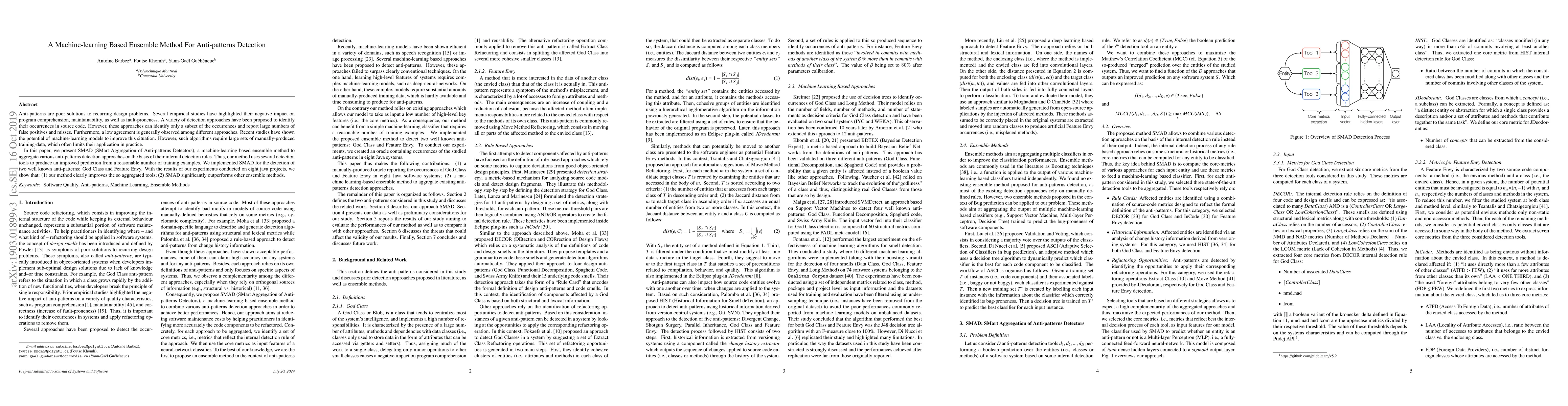 This paper introduces SMAD, a machine-learning ensemble method for detecting anti-patterns in source code, which aggregates multiple detection tools to improve accuracy and reduce false positives. Experiments on eight Java projects demonstrate that SMAD significantly outperforms other ensemble methods.