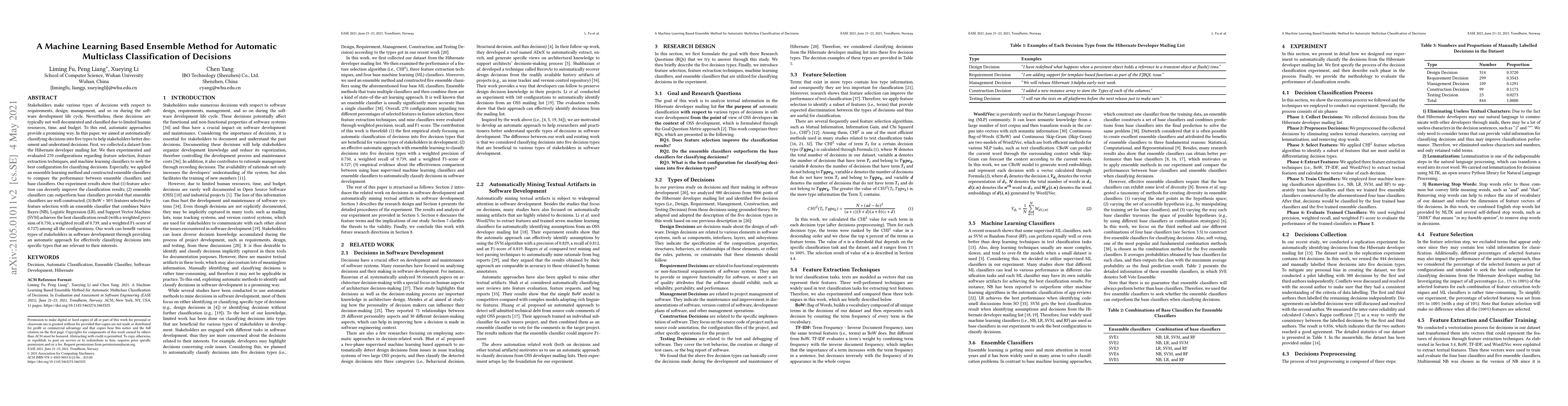 This paper proposes an ensemble machine learning method for automatic classification of software development decisions into five types. The best performing ensemble classifier, combining Na\"ive Bayes, Logistic Regression, and Support Vector Machine, achieved a weighted precision of 0.750, recall of 0.739, and F1-score of 0.727, outperforming individual classifiers.