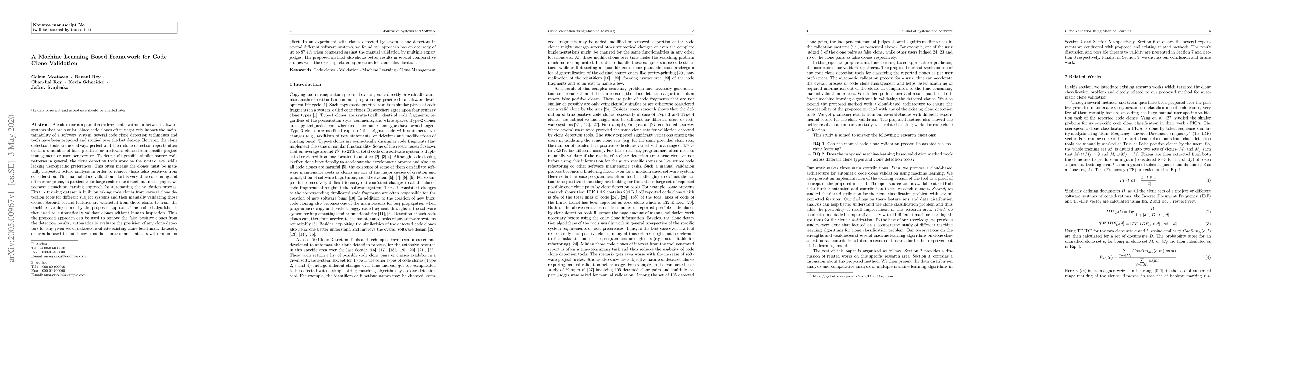 A machine learning-based approach was used to assist in automatic code clone validation.