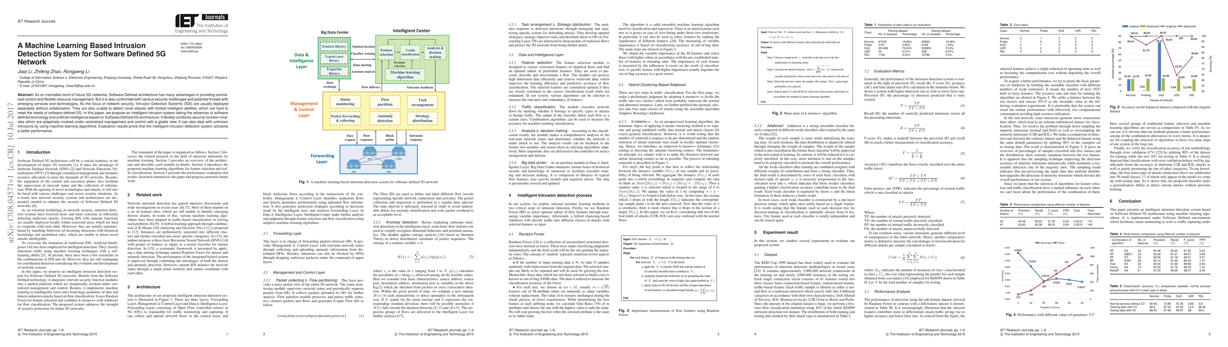 The paper presents an innovative machine learning-based intrusion detection system for Software Defined 5G networks, combining Random Forest for feature selection and a hybrid clustering-based AdaBoost for traffic classification.