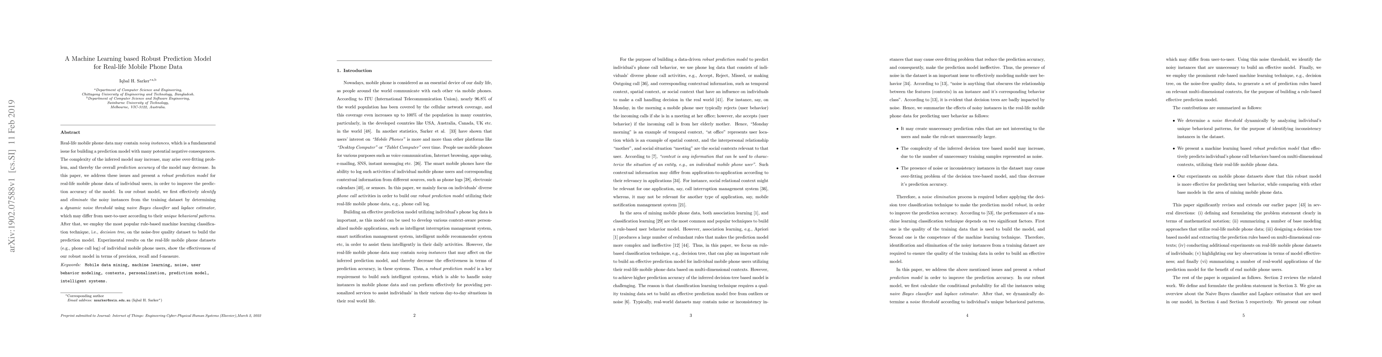 This paper proposes a robust machine learning model to predict real-life mobile phone data by first identifying and eliminating noisy instances using a dynamic noise threshold determined by a naive Bayes classifier and Laplace estimator. It then employs a decision tree to build the prediction model, demonstrating improved precision, recall, and f-measure on real-life datasets.