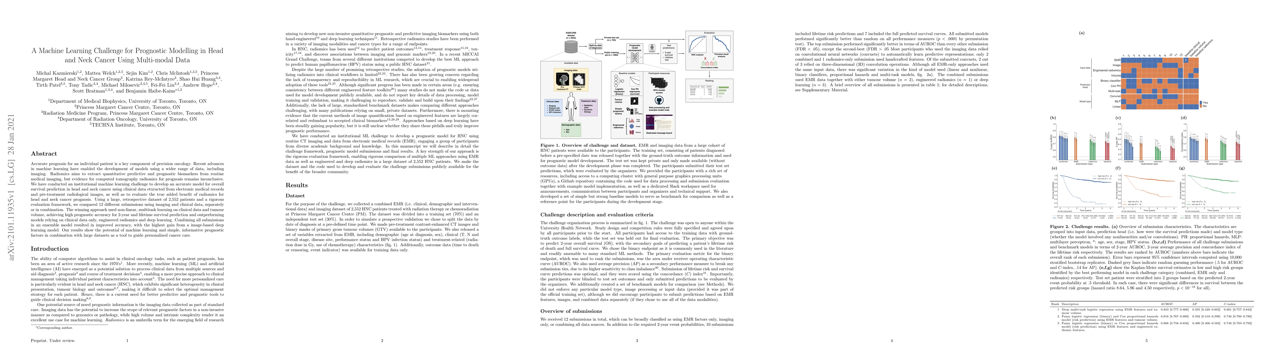 This research presents a machine learning challenge to develop a prognostic model for head and neck cancer using clinical and imaging data, finding that non-linear, multitask learning on clinical data and tumour volume achieved the highest accuracy. Combining various models in an ensemble further improved prediction accuracy, highlighting the potential of machine learning for personalized cancer care.