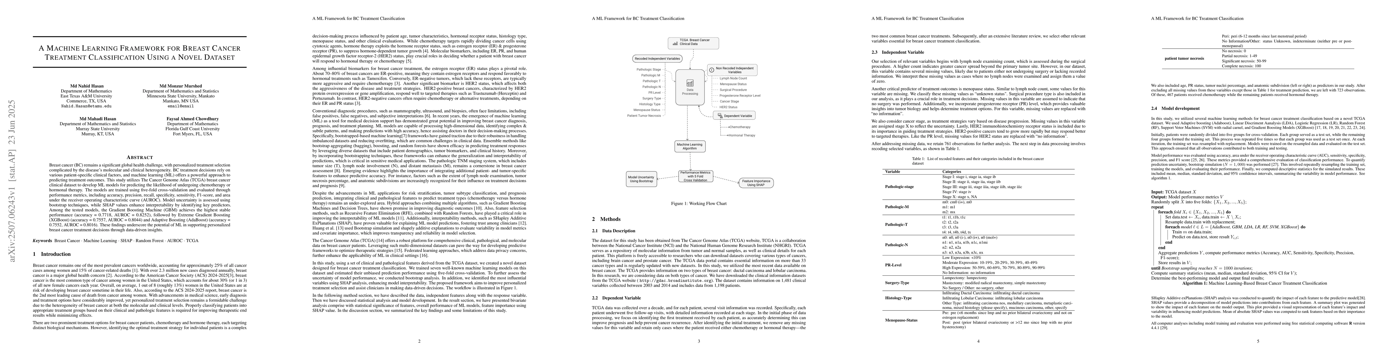 This study utilized machine learning algorithms to predict breast cancer treatment likelihood based on clinical variables.