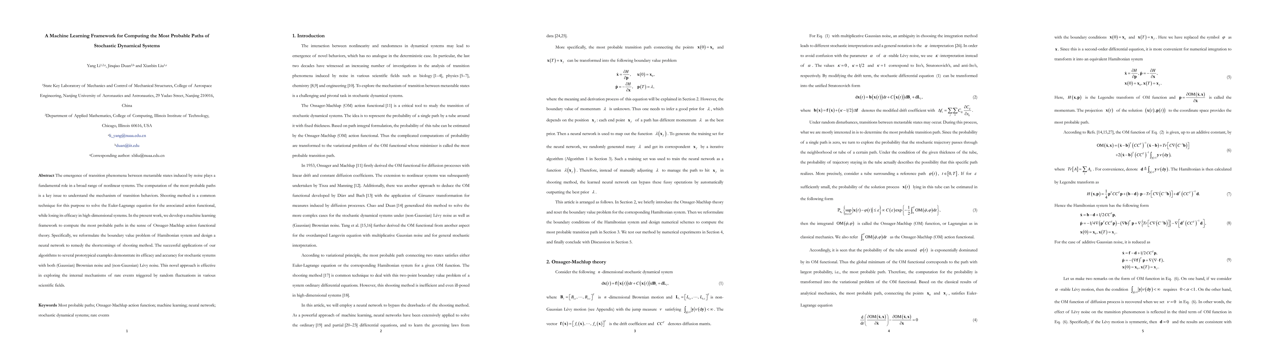 This paper introduces a machine learning framework to compute the most probable paths in stochastic dynamical systems, addressing the limitations of traditional shooting methods in high-dimensional systems. The proposed neural network approach effectively computes Onsager-Machlup action functionals for both Gaussian and non-Gaussian noise, demonstrating accuracy in exploring rare event transitions.