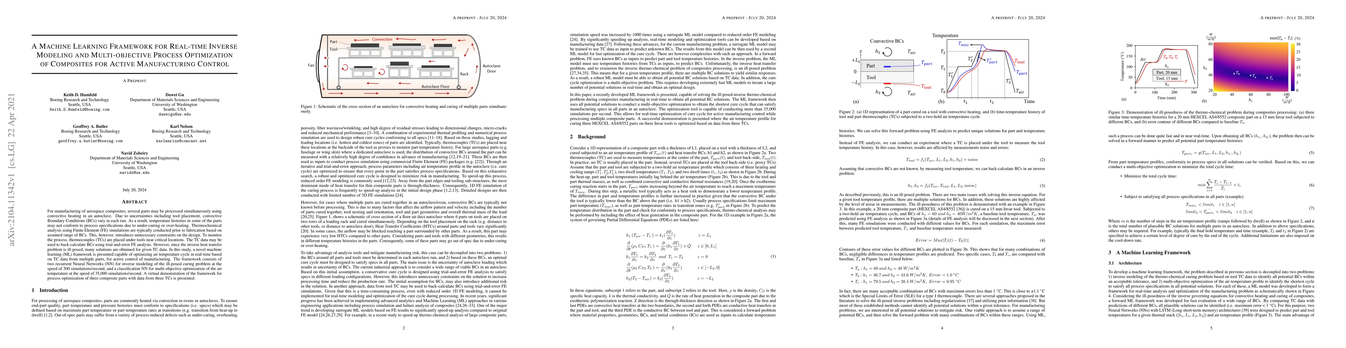 For manufacturing of aerospace composites, several parts may be processed simultaneously using convective heating in an autoclave. Due to uncertainties including tool placement, convective Boundary Conditions (BCs) vary in each run. As a result, temperature histories in some of the parts may not conform to process specifications due to under-curing or over-heating. Thermochemical analysis using Finite Element (FE) simulations are typically conducted prior to fabrication based on assumed range of BCs. This, however, introduces unnecessary constraints on the design. To monitor the process, thermocouples (TCs) are placed under tools near critical locations. The TC data may be used to back-calculate BCs using trial-and-error FE analysis. However, since the inverse heat transfer problem is ill-posed, many solutions are obtained for given TC data. In this study, a novel machine learning (ML) framework is presented capable of optimizing air temperature cycle in real-time based on TC data from multiple parts, for active control of manufacturing. The framework consists of two recurrent Neural Networks (NN) for inverse modeling of the ill-posed curing problem at the speed of 300 simulations/second, and a classification NN for multi-objective optimization of the air temperature at the speed of 35,000 simulations/second. A virtual demonstration of the framework for process optimization of three composite parts with data from three TCs is presented.