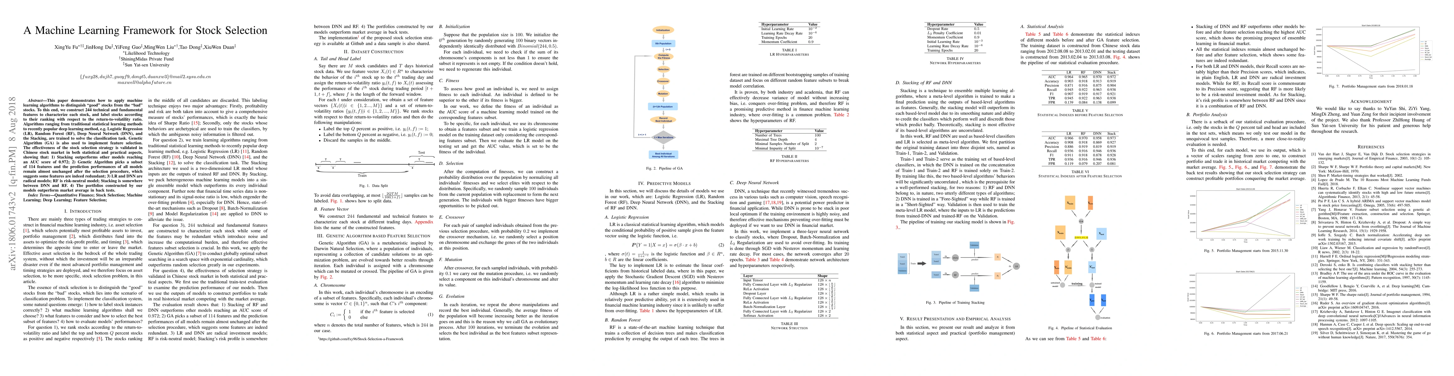 This paper demonstrates how to apply machine learning algorithms to distinguish good stocks from the bad stocks. To this end, we construct 244 technical and fundamental features to characterize each stock, and label stocks according to their ranking with respect to the return-to-volatility ratio. Algorithms ranging from traditional statistical learning methods to recently popular deep learning method, e.g. Logistic Regression (LR), Random Forest (RF), Deep Neural Network (DNN), and the Stacking, are trained to solve the classification task. Genetic Algorithm (GA) is also used to implement feature selection. The effectiveness of the stock selection strategy is validated in Chinese stock market in both statistical and practical aspects, showing that: 1) Stacking outperforms other models reaching an AUC score of 0.972; 2) Genetic Algorithm picks a subset of 114 features and the prediction performances of all models remain almost unchanged after the selection procedure, which suggests some features are indeed redundant; 3) LR and DNN are radical models; RF is risk-neutral model; Stacking is somewhere between DNN and RF. 4) The portfolios constructed by our models outperform market average in back tests.