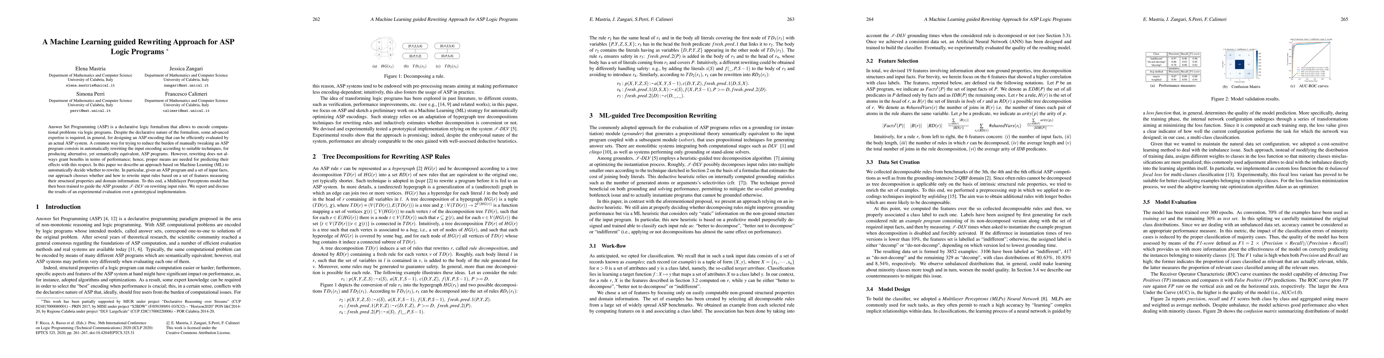 This paper proposes a machine learning approach to guide the automatic rewriting of Answer Set Programming (ASP) logic programs to improve performance. It employs a Multilayer Perceptron model trained on features derived from program structure and domain data to decide when to apply rewriting, enhancing the ASP grounder I-DLV.
