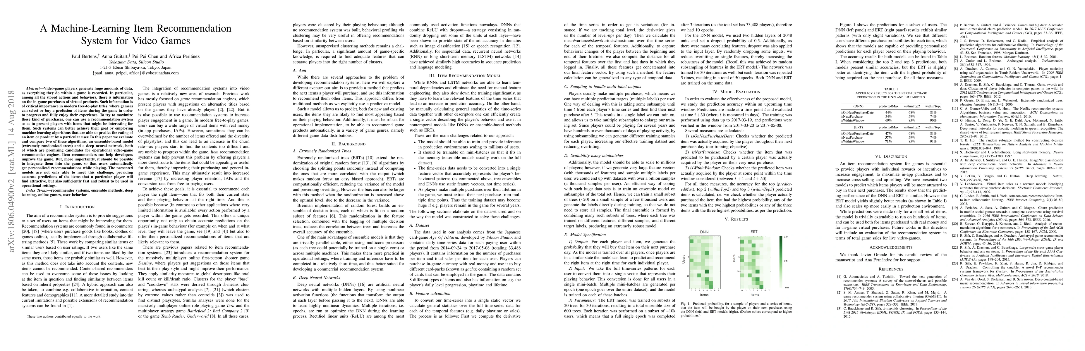 Video-game players generate huge amounts of data, as everything they do within a game is recorded. In particular, among all the stored actions and behaviors, there is information on the in-game purchases of virtual products. Such information is of critical importance in modern free-to-play titles, where gamers can select or buy a profusion of items during the game in order to progress and fully enjoy their experience. To try to maximize these kind of purchases, one can use a recommendation system so as to present players with items that might be interesting for them. Such systems can better achieve their goal by employing machine learning algorithms that are able to predict the rating of an item or product by a particular user. In this paper we evaluate and compare two of these algorithms, an ensemble-based model (extremely randomized trees) and a deep neural network, both of which are promising candidates for operational video-game recommender engines. Item recommenders can help developers improve the game. But, more importantly, it should be possible to integrate them into the game, so that users automatically get personalized recommendations while playing. The presented models are not only able to meet this challenge, providing accurate predictions of the items that a particular player will find attractive, but also sufficiently fast and robust to be used in operational settings.