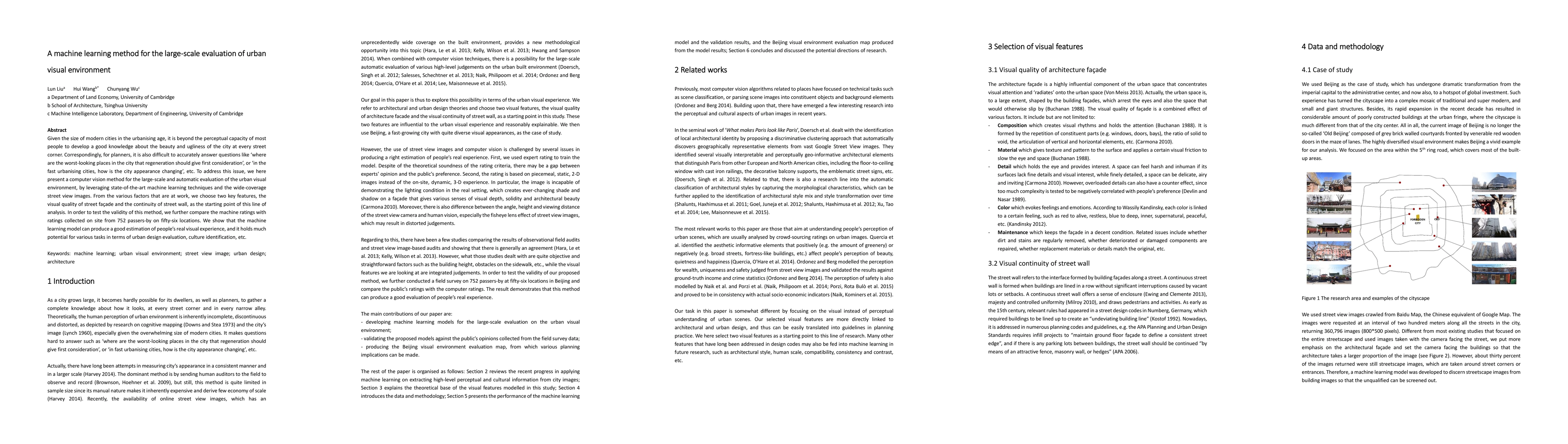 This paper introduces a machine learning method using computer vision to automatically evaluate urban visual environments on a large scale, focusing on street facade quality and street wall continuity. The method is validated by comparing machine ratings with on-site human ratings, demonstrating its effectiveness in estimating real visual experiences and its potential for urban design and culture identification.