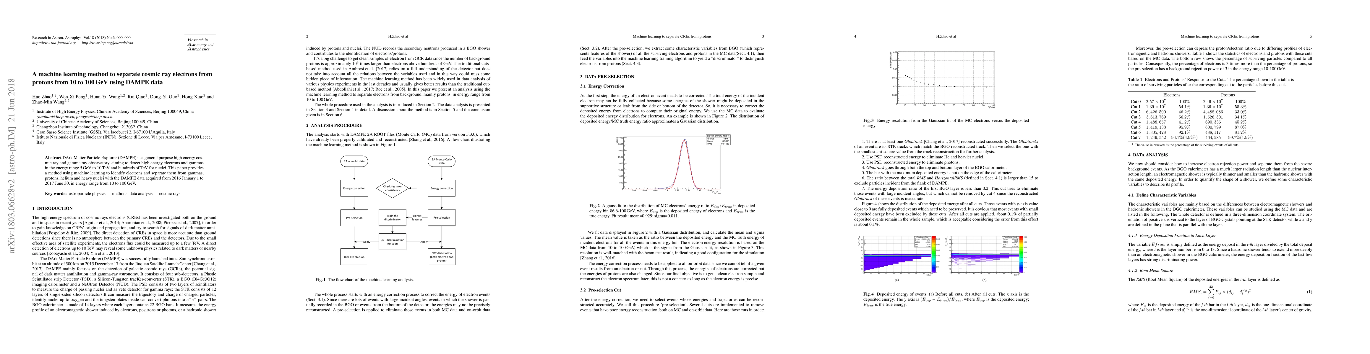 This paper introduces a machine learning technique to distinguish cosmic ray electrons from protons in the 10 to 100 GeV energy range using DAMPE data, aiming to improve the separation of electrons from other particles like gammas and helium nuclei. The method is applied to data collected from January 2016 to June 2017.