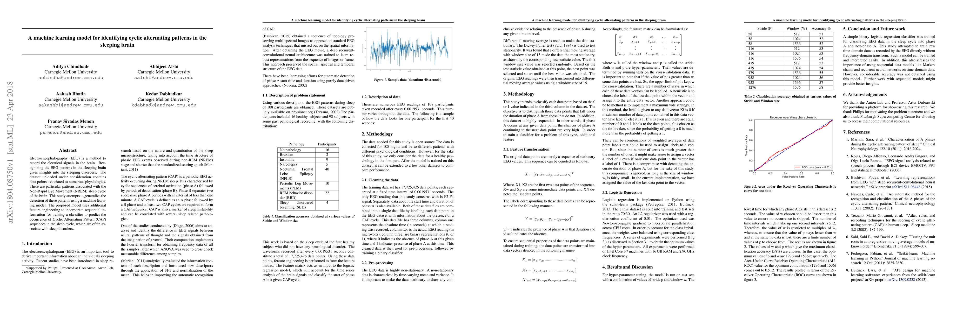 Electroencephalography (EEG) is a method to record the electrical signals in the brain. Recognizing the EEG patterns in the sleeping brain gives insights into the understanding of sleeping disorders. The dataset under consideration contains EEG data points associated with various physiological conditions. This study attempts to generalize the detection of particular patterns associated with the Non-Rapid Eye Movement (NREM) sleep cycle of the brain using a machine learning model. The proposed model uses additional feature engineering to incorporate sequential information for training a classifier to predict the occurrence of Cyclic Alternating Pattern (CAP) sequences in the sleep cycle, which are often associated with sleep disorders.