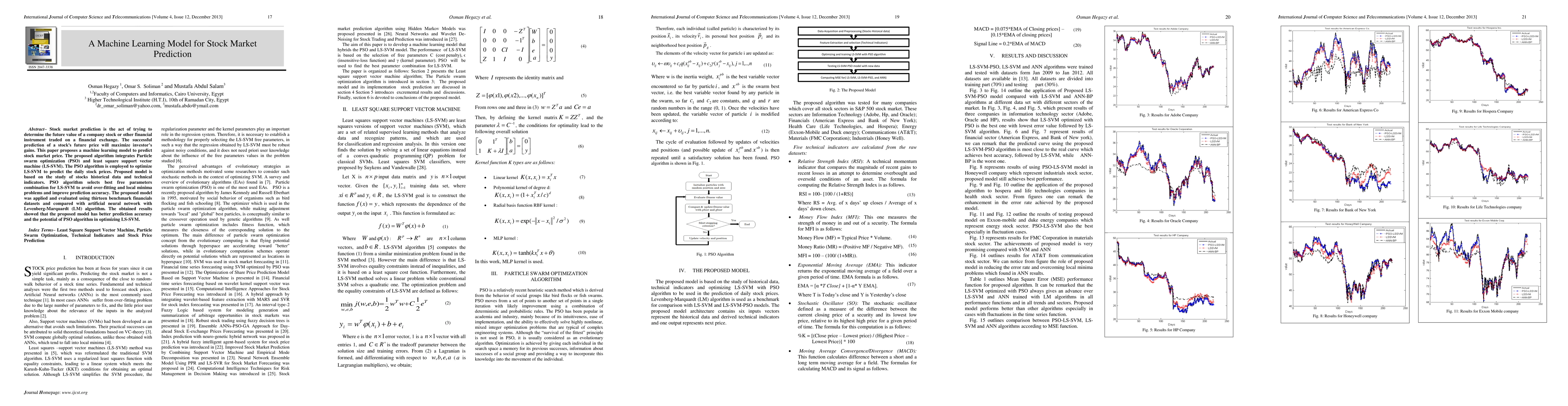 The research proposes a machine learning model that integrates Particle Swarm Optimization (PSO) algorithm with Least Squares Support Vector Machine (LS-SVM) for stock price prediction using financial technical indicators such as Relative Strength Index, Money Flow Index, Exponential Moving Average, Stochastic Oscillator, and Moving Average Convergence/Divergence.
