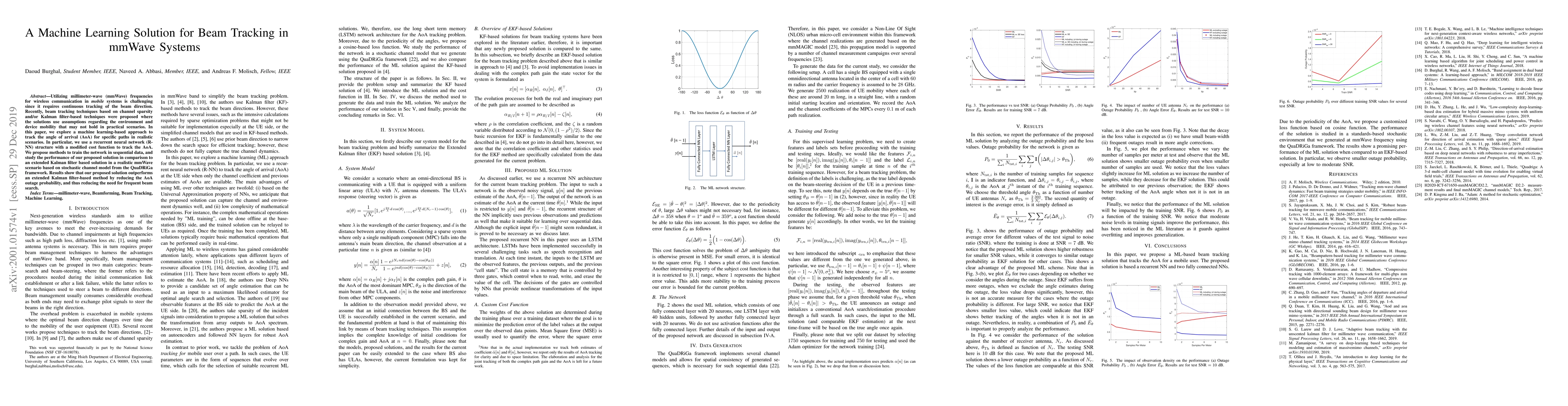This paper proposes a machine learning-based approach using a recurrent neural network to track the angle of arrival in mmWave systems, outperforming traditional Kalman filter methods by reducing AoA outage probability and the need for frequent beam search. The performance is evaluated against an extended Kalman filter in a realistic mmWave scenario.