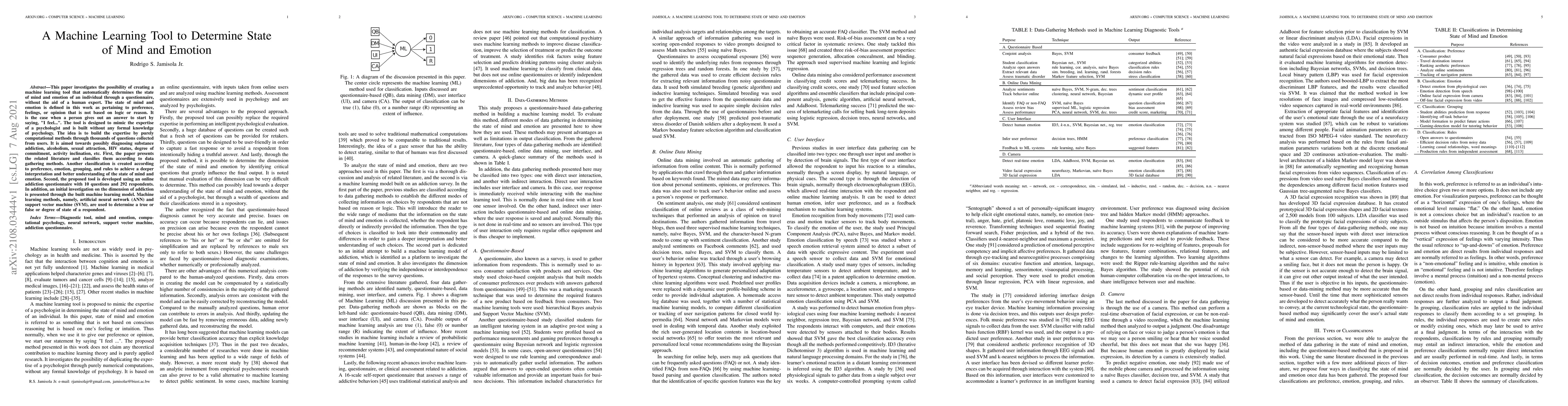 This paper investigates the possibility of creating a machine learning tool that automatically determines the state of mind and emotion of an individual through a questionnaire, without the aid of a human expert. The state of mind and emotion is defined in this work as pertaining to preference, feelings, or opinion that is not based on logic or reason. It is the case when a person gives out an answer to start by saying, "I feel...". The tool is designed to mimic the expertise of a psychologist and is built without any formal knowledge of psychology. The idea is to build the expertise by purely computational methods through thousands of questions collected from users. It is aimed towards possibly diagnosing substance addiction, alcoholism, sexual attraction, HIV status, degree of commitment, activity inclination, etc. First, the paper presents the related literature and classifies them according to data gathering methods. Another classification is created according to preference, emotion, grouping, and rules to achieve a deeper interpretation and better understanding of the state of mind and emotion. Second, the proposed tool is developed using an online addiction questionnaire with 10 questions and 292 respondents. In addition, an initial investigation on the dimension of addiction is presented through the built machine learning model. Machine learning methods, namely, artificial neural network (ANN) and support vector machine (SVM), are used to determine a true or false or degree of state of a respondent.