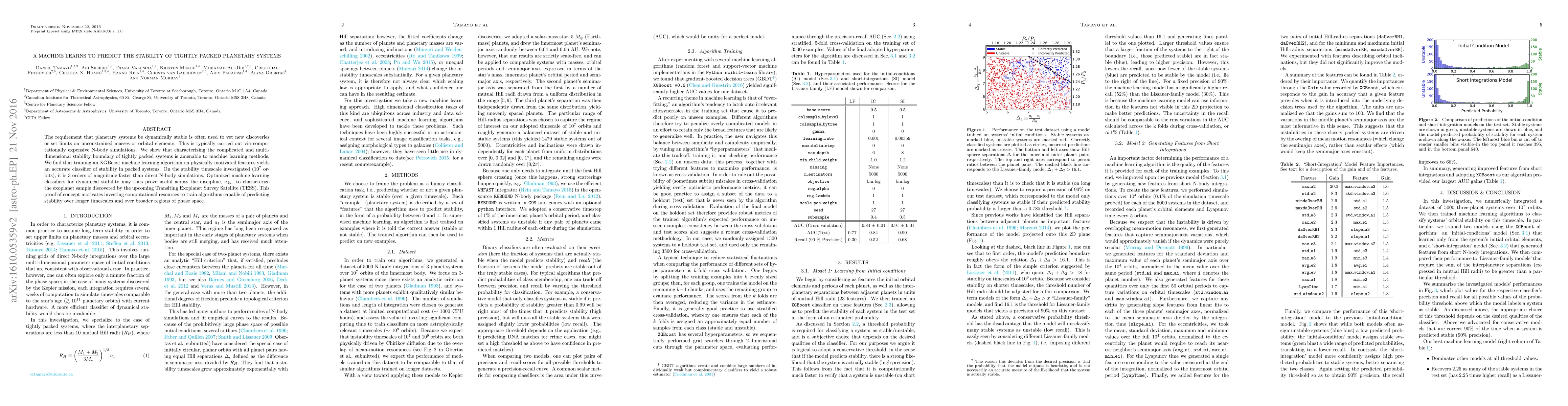 This paper demonstrates that an XGBoost machine learning algorithm can efficiently predict the stability of tightly packed planetary systems, achieving results 3 orders of magnitude faster than traditional N-body simulations. The machine learning approach uses physically motivated features to classify stability, showing potential for applications in exoplanet characterization.