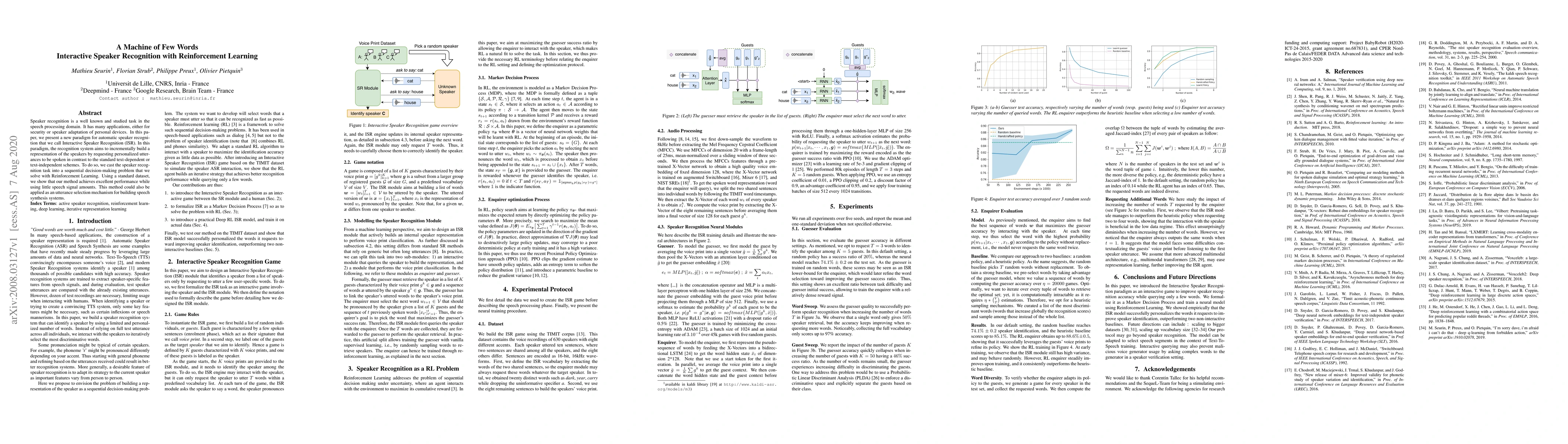 Speaker recognition is a well known and studied task in the speech processing domain. It has many applications, either for security or speaker adaptation of personal devices. In this paper, we present a new paradigm for automatic speaker recognition that we call Interactive Speaker Recognition (ISR). In this paradigm, the recognition system aims to incrementally build a representation of the speakers by requesting personalized utterances to be spoken in contrast to the standard text-dependent or text-independent schemes. To do so, we cast the speaker recognition task into a sequential decision-making problem that we solve with Reinforcement Learning. Using a standard dataset, we show that our method achieves excellent performance while using little speech signal amounts. This method could also be applied as an utterance selection mechanism for building speech synthesis systems.