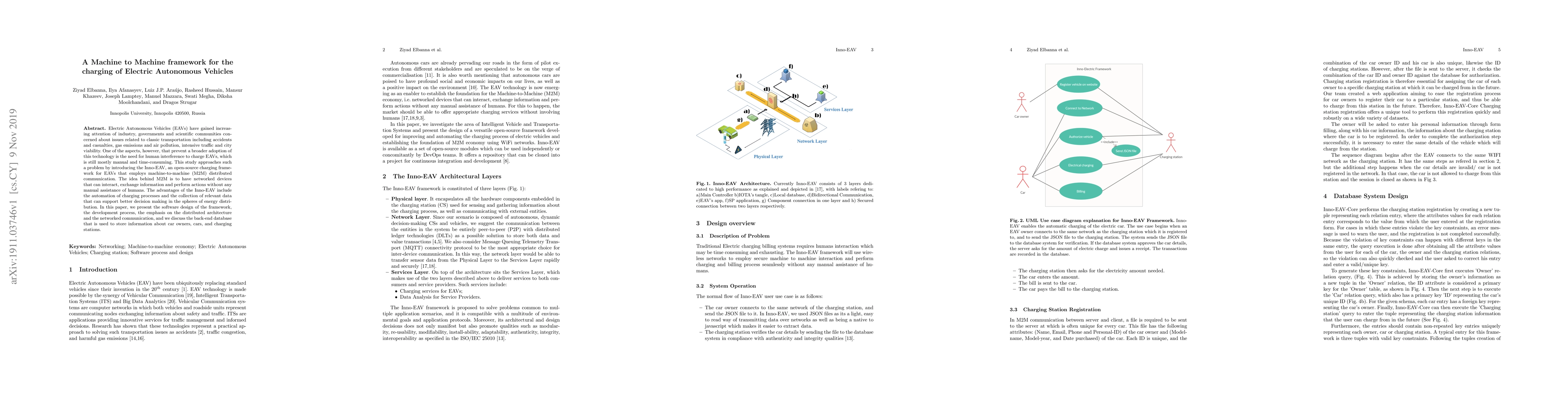 Electric Autonomous Vehicles (EAVs) have gained increasing attention of industry, governments and scientific communities concerned about issues related to classic transportation including accidents and casualties, gas emissions and air pollution, intensive traffic and city viability. One of the aspects, however, that prevent a broader adoption of this technology is the need for human interference to charge EAVs, which is still mostly manual and time-consuming. This study approaches such a problem by introducing the Inno-EAV, an open-source charging framework for EAVs that employs machine-to-machine (M2M) distributed communication. The idea behind M2M is to have networked devices that can interact, exchange information and perform actions without any manual assistance of humans. The advantages of the Inno-EAV include the automation of charging processes and the collection of relevant data that can support better decision making in the spheres of energy distribution. In this paper, we present the software design of the framework, the development process, the emphasis on the distributed architecture and the networked communication, and we discuss the back-end database that is used to store information about car owners, cars, and charging stations.