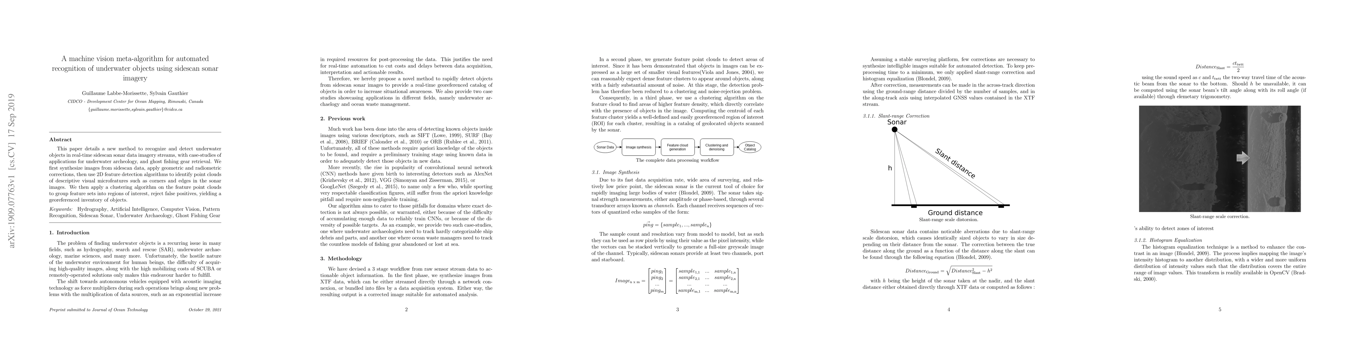 This research presents a new automated method for identifying underwater objects in sonar images, useful for archaeology and fishing gear retrieval. It uses image correction, feature detection, and clustering techniques to accurately locate and classify objects in real-time.