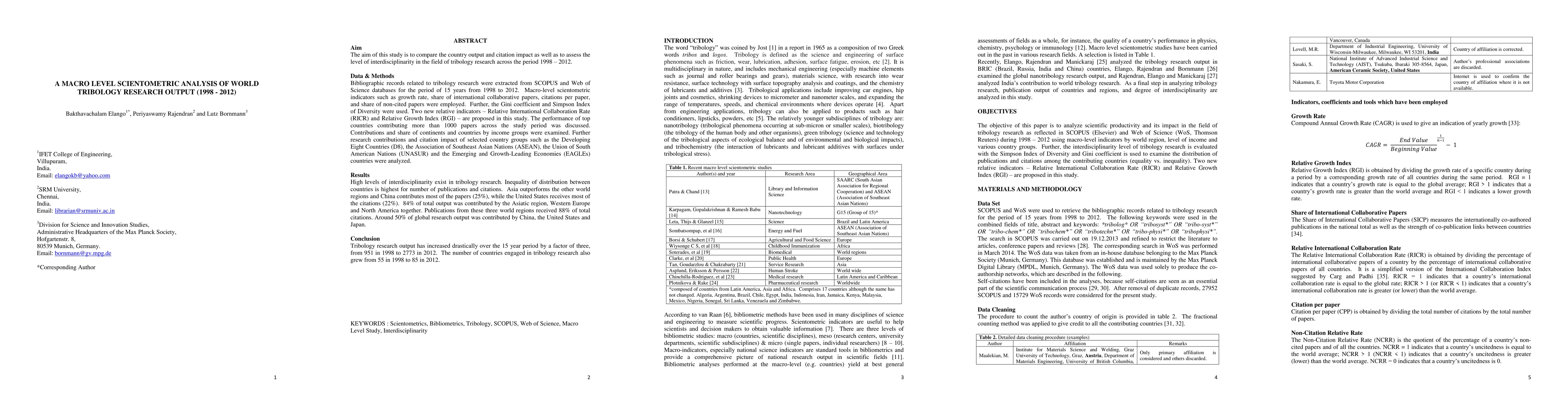 This study analyzed world tribology research output from 1998 to 2012, revealing that Asia dominates the field, with China contributing 25% of papers and the US receiving 22% of citations, while inequality in distribution is high across countries.