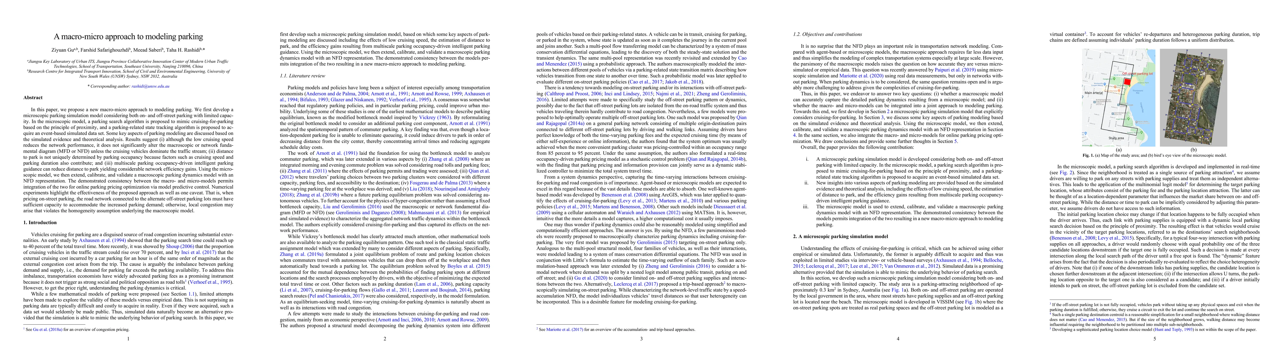 This paper proposes a macro-micro approach to modeling parking, integrating a microscopic simulation with a macroscopic dynamics model. The microscopic model simulates parking search and occupancy, while the macroscopic model uses network fundamental diagrams for optimization. The study finds that multiscale guidance can improve efficiency but warns that increased on-street parking pricing must be supported by adequate off-street capacity to avoid congestion.