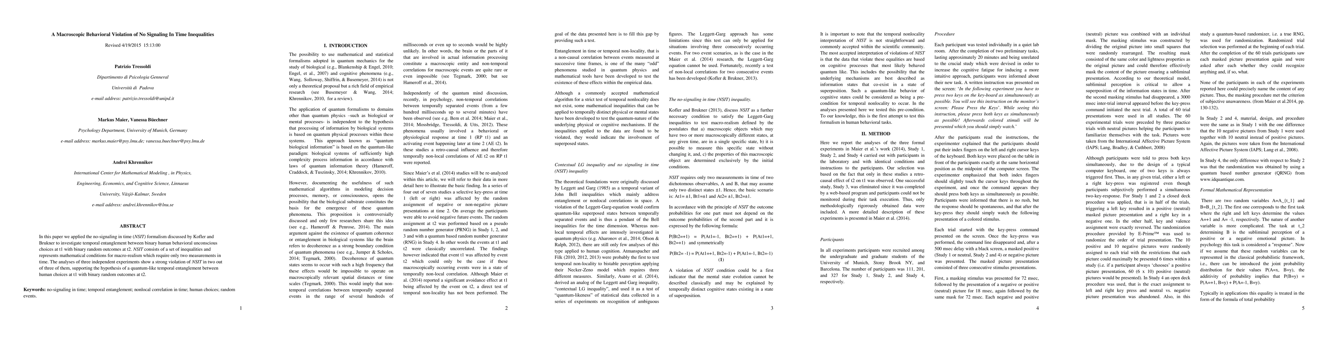 Researchers found a strong violation of quantum-like no-signaling in time (NSIT) inequalities in two out of three human behavioral experiments, suggesting temporal entanglement between choices made before random outcomes.