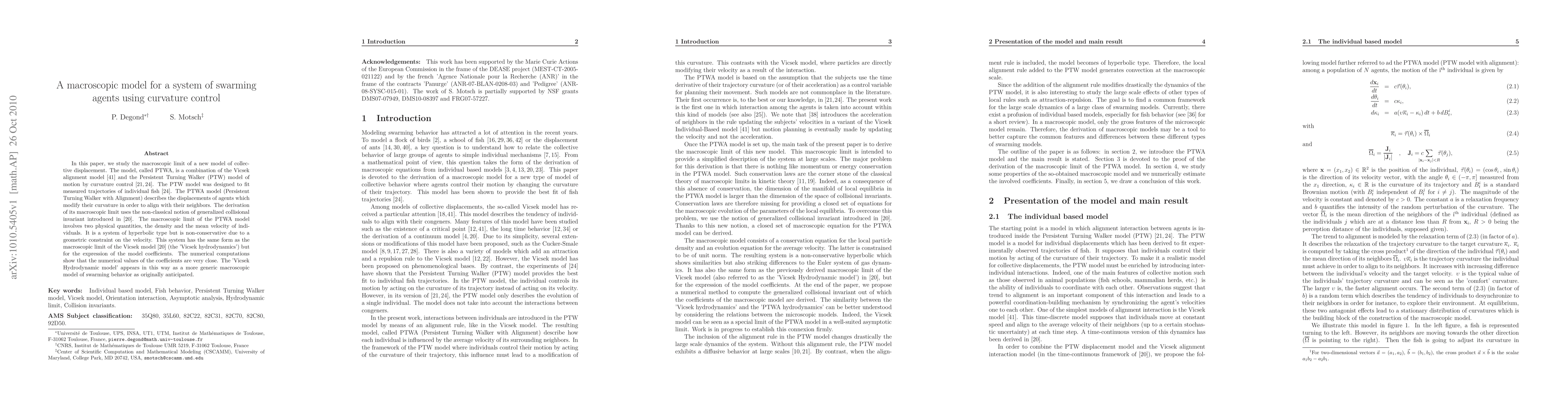 In this paper, we study the macroscopic limit of a new model of collective displacement. The model, called PTWA, is a combination of the Vicsek alignment model and the Persistent Turning Walker (PTW) model of motion by curvature control. The PTW model was designed to fit measured trajectories of individual fish. The PTWA model (Persistent Turning Walker with Alignment) describes the displacements of agents which modify their curvature in order to align with their neighbors. The derivation of its macroscopic limit uses the non-classical notion of generalized collisional invariant. The macroscopic limit of the PTWA model involves two physical quantities, the density and the mean velocity of individuals. It is a system of hyperbolic type but is non-conservative due to a geometric constraint on the velocity. This system has the same form as the macroscopic limit of the Vicsek model (the 'Vicsek hydrodynamics') but for the expression of the model coefficients. The numerical computations show that the numerical values of the coefficients are very close. The 'Vicsek Hydrodynamic model' appears in this way as a more generic macroscopic model of swarming behavior as originally anticipated.