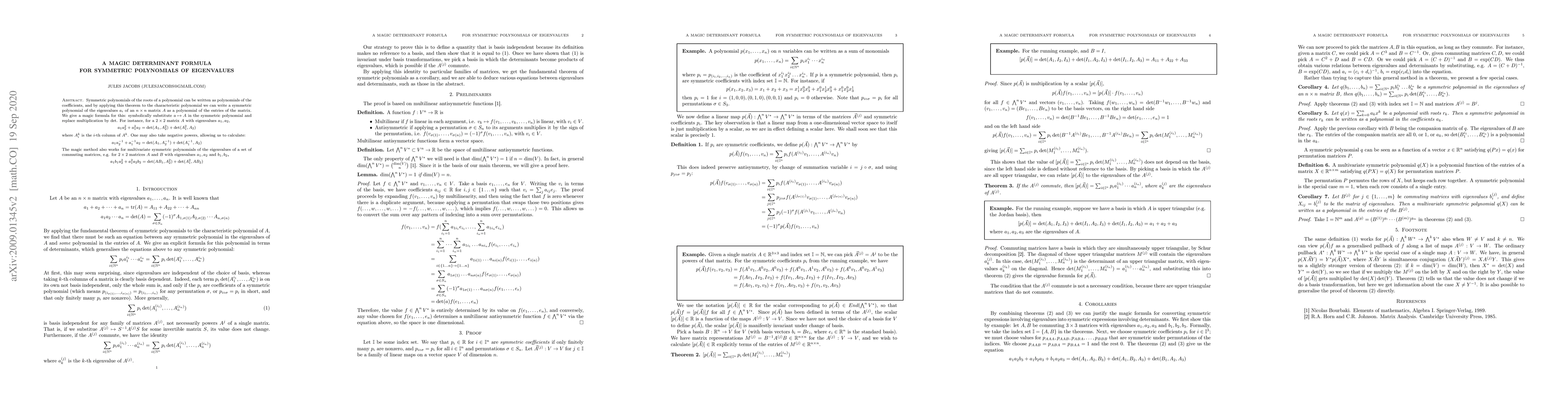 Symmetric polynomials of the roots of a polynomial can be written as polynomials of the coefficients, and by applying this to the characteristic polynomial we can write a symmetric polynomial of the eigenvalues $a_{i}$ of an $n\times n$ matrix $A$ as a polynomial of the entries of the matrix. We give a magic formula for this: symbolically substitute $a\mapsto A$ in the symmetric polynomial and replace multiplication by $\det$. For instance, for a $2\times2$ matrix $A$ with eigenvalues $a_{1},a_{2}$, \begin{align*} a_1 a_2^2 +a_1^2 a_2 & =\det(A_1, A_2^2)+ \det(A_1^2, A_2) \end{align*} where $A_i^k$ is the $i$-th column of $A^k$. One may also take negative powers, allowing us to calculate: \begin{align*} a_1a_2^{-1}+a_1^{-1}a_{2} & =\det(A_{1},A_{2}^{-1})+\det(A_1^{-1},A_{2}) \end{align*} The magic method also works for multivariate symmetric polynomials of the eigenvalues of a set of commuting matrices, e.g. for $2\times2$ matrices $A$ and $B$ with eigenvalues $a_1,a_2$ and $b_{1},b_{2}$, \begin{align*} a_1 b_1 a_2^2 + a_1^2a_2b_2 & = \det(AB_{1},A_2^2) + \det(A_1^2,AB_2) \end{align*}