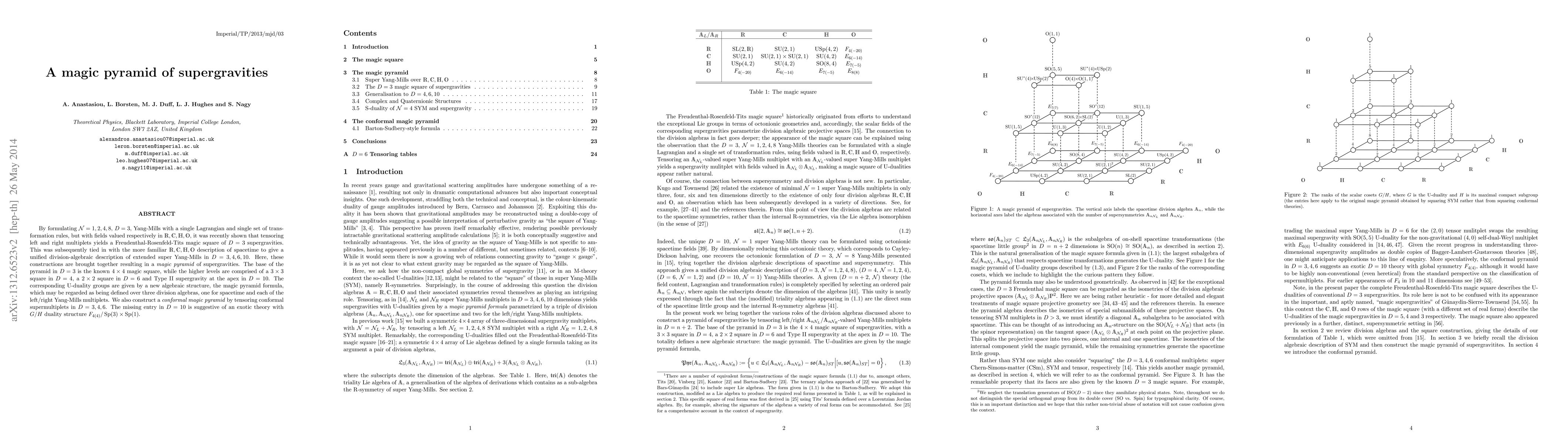 By formulating N = 1, 2, 4, 8, D = 3, Yang-Mills with a single Lagrangian and single set of transformation rules, but with fields valued respectively in R,C,H,O, it was recently shown that tensoring left and right multiplets yields a Freudenthal-Rosenfeld-Tits magic square of D = 3 supergravities. This was subsequently tied in with the more familiar R,C,H,O description of spacetime to give a unified division-algebraic description of extended super Yang-Mills in D = 3, 4, 6, 10. Here, these constructions are brought together resulting in a magic pyramid of supergravities. The base of the pyramid in D = 3 is the known 4x4 magic square, while the higher levels are comprised of a 3x3 square in D = 4, a 2x2 square in D = 6 and Type II supergravity at the apex in D = 10. The corresponding U-duality groups are given by a new algebraic structure, the magic pyramid formula, which may be regarded as being defined over three division algebras, one for spacetime and each of the left/right Yang-Mills multiplets. We also construct a conformal magic pyramid by tensoring conformal supermultiplets in D = 3, 4, 6. The missing entry in D = 10 is suggestive of an exotic theory with G/H duality structure F4(4)/Sp(3) x Sp(1).