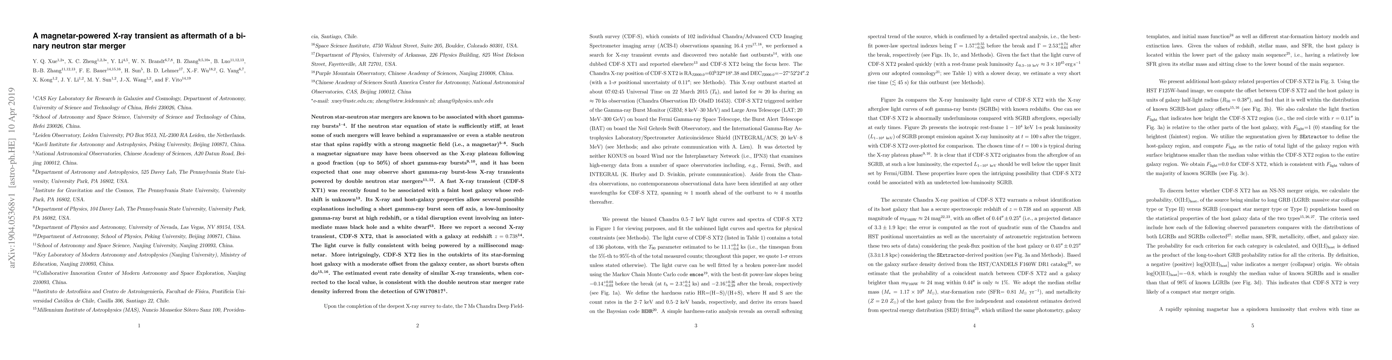 This paper reports the discovery of CDF-S XT2, a magnetar-powered X-ray transient following a binary neutron star merger, providing evidence consistent with the merger's aftermath. The transient's light curve and host galaxy offset support a magnetar origin, aligning with the merger rate density inferred from gravitational wave detections.