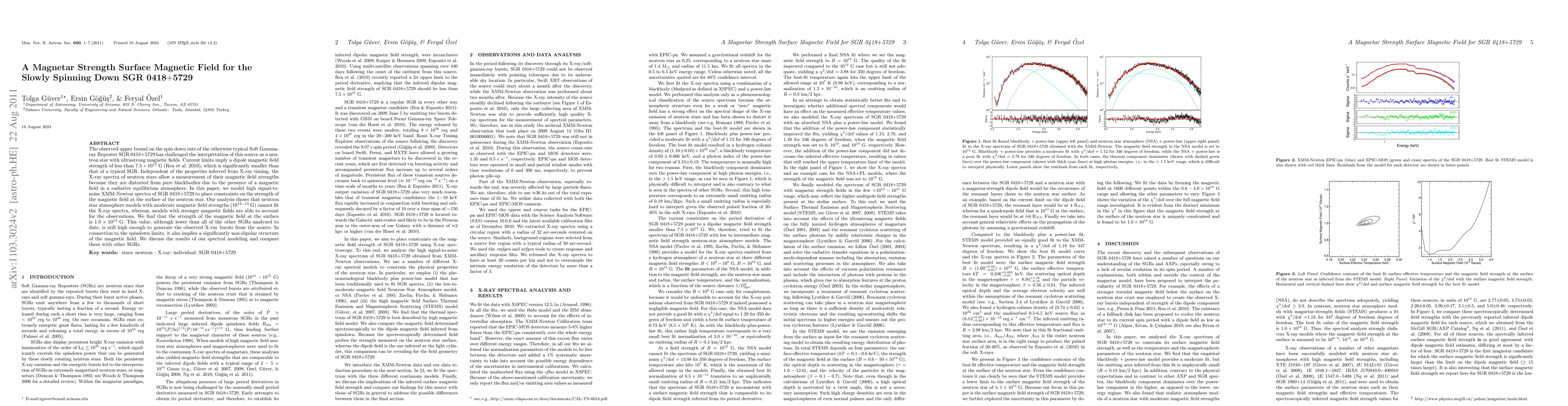 The observed upper bound on the spin down rate of the otherwise typical Soft Gamma-ray Repeater SGR 0418+5729 has challenged the interpretation of this source as a neutron star with ultrastrong magnetic fields. Current limits imply a dipole magnetic field strength of less than 7.5 x 10^{12} G (Rea et al. 2010), which is significantly smaller than that of a typical SGR. Independent of the properties inferred from X-ray timing, the X-ray spectra of neutron stars allow a measurement of their magnetic field strengths because they are distorted from pure blackbodies due to the presence of a magnetic field in a radiative equilibrium atmosphere. In this paper, we model high signal-to-noise XMM-Newton spectra of SGR 0418+5729 to place constraints on the strength of the magnetic field at the surface of the neutron star. Our analysis shows that neutron star atmosphere models with moderate magnetic field strengths (10^{12-13} G) cannot fit the X-ray spectra, whereas, models with stronger magnetic fields are able to account for the observations. We find that the strength of the magnetic field at the surface is 1.0 x 10^{14} G. This value, although lower than all of the other SGRs analyzed to date, is still high enough to generate the observed X-ray bursts from the source. In connection to the spindown limits, it also implies a significantly non-dipolar structure of the magnetic field. We discuss the results of our spectral modeling and compare them with other SGRs.