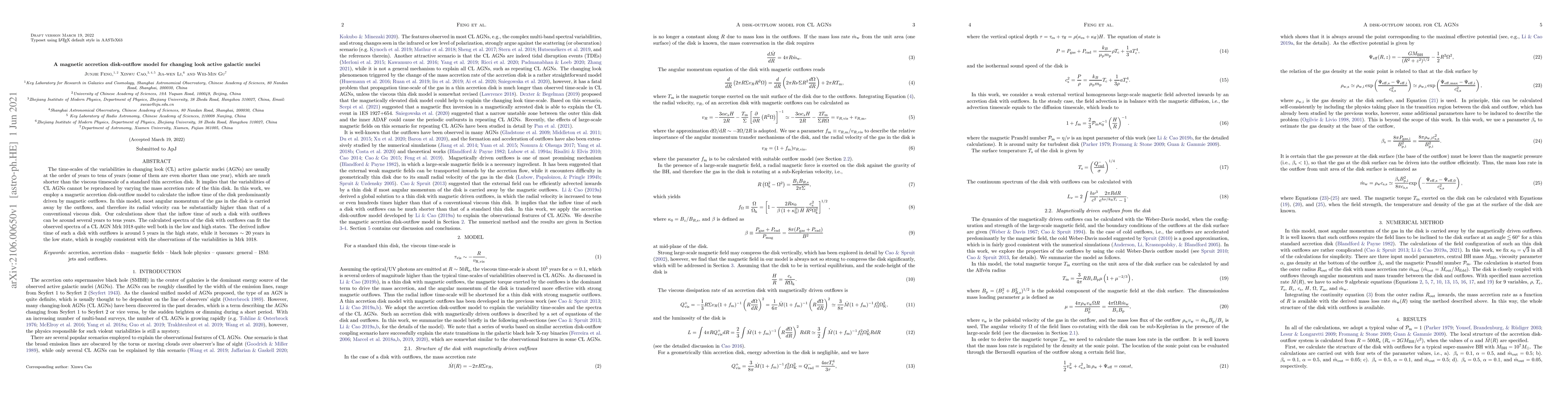 This paper proposes a magnetic accretion disk-outflow model to explain the rapid variability in changing look active galactic nuclei (AGNs). The model suggests that magnetic outflows can significantly reduce the inflow time, matching the observed variability timescales of several years to tens of years.