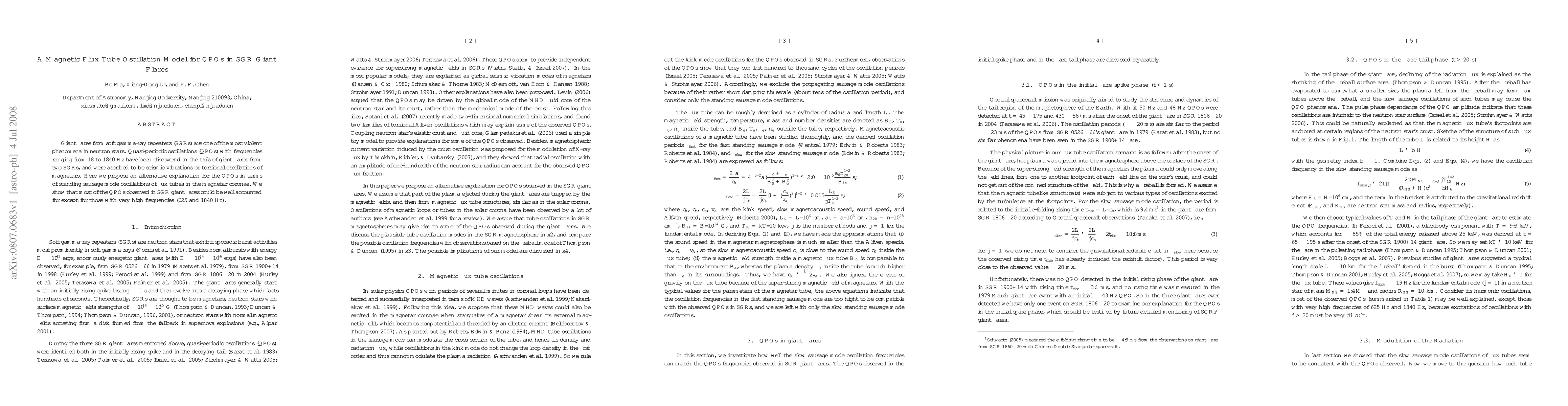 This paper proposes a magnetic flux tube oscillation model to explain quasi-periodic oscillations (QPOs) in the tails of giant flares from soft gamma-ray repeaters (SGRs), suggesting that these oscillations are standing sausage mode vibrations in the magnetar coronae. The model accounts for most observed QPOs except for the highest frequencies.