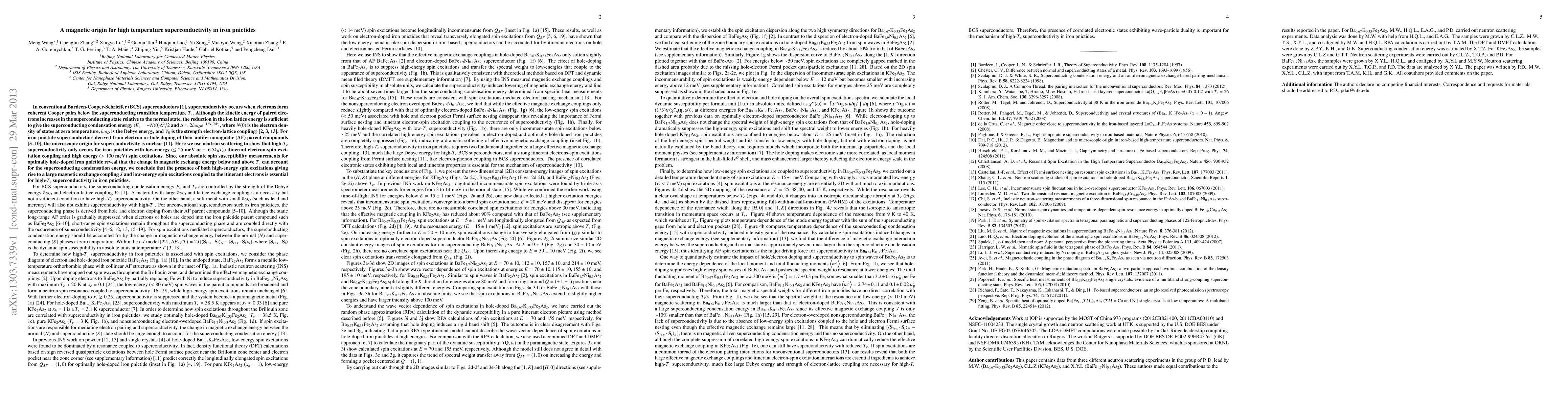 This paper demonstrates that high-temperature superconductivity in iron pnictides arises from magnetic interactions, specifically low-energy electron-spin excitation coupling and high-energy spin excitations, which provide the necessary magnetic exchange energy for superconductivity. Neutron scattering and spin susceptibility measurements support this magnetic origin.