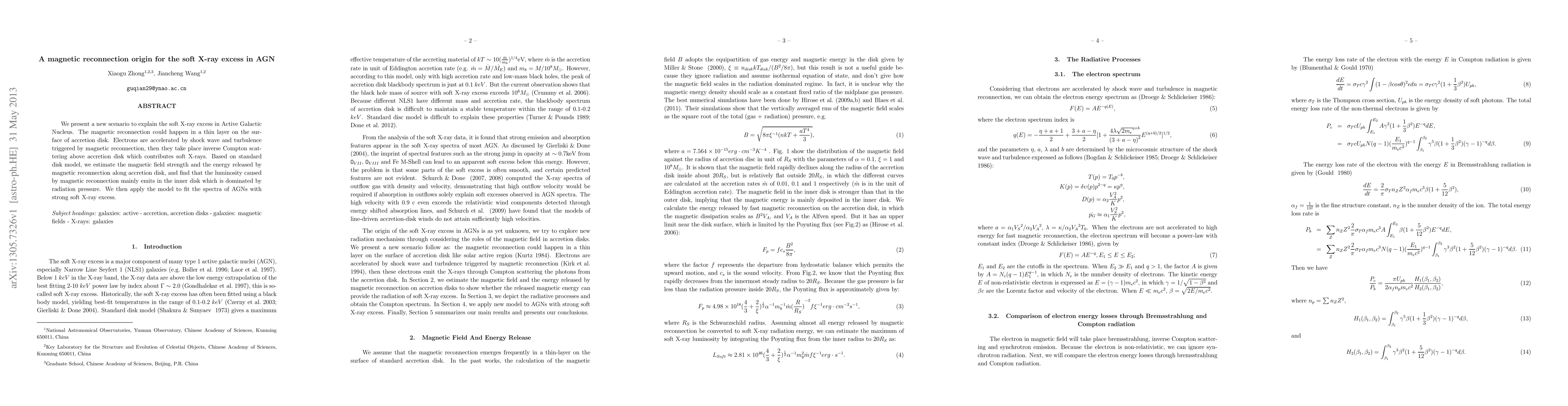 This paper proposes that magnetic reconnection in the accretion disk of Active Galactic Nuclei (AGN) generates the soft X-ray excess through accelerated electrons undergoing inverse Compton scattering. The model estimates the magnetic field strength and energy release, finding that the inner disk, dominated by radiation pressure, is the primary source of this excess.