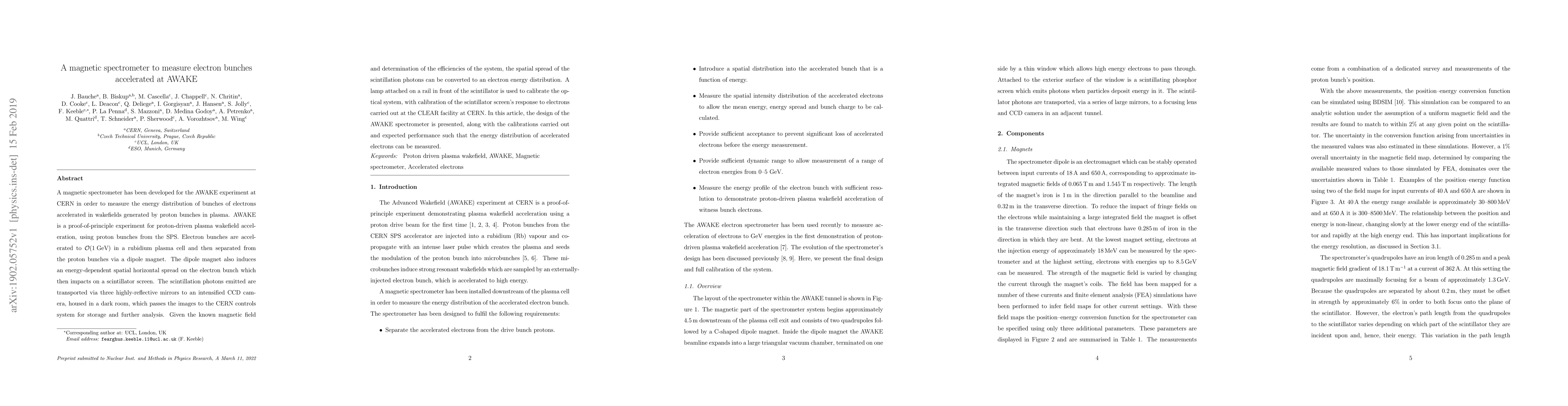 The paper describes the development of a magnetic spectrometer for the AWAKE experiment at CERN to measure electron energy distributions in proton-driven plasma wakefields. The spectrometer uses a dipole magnet to induce an energy-dependent spatial spread on electron bunches, which is then detected by an intensified CCD camera after passing through reflective mirrors and a scintillator screen.