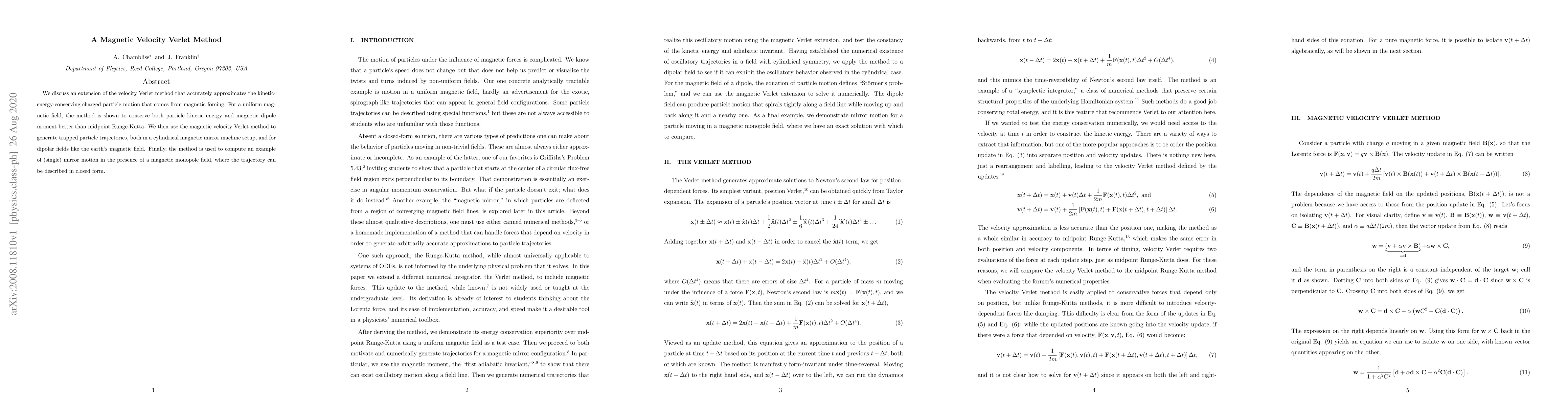 We discuss an extension of the velocity Verlet method that accurately approximates the kinetic-energy-conserving charged particle motion that comes from magnetic forcing. For a uniform magnetic field, the method is shown to conserve both particle kinetic energy and magnetic dipole moment better than midpoint Runge-Kutta. We then use the magnetic velocity Verlet method to generate trapped particle trajectories, both in a cylindrical magnetic mirror machine setup, and for dipolar fields like the earth's magnetic field. Finally, the method is used to compute an example of (single) mirror motion in the presence of a magnetic monopole field, where the trajectory can be described in closed form.